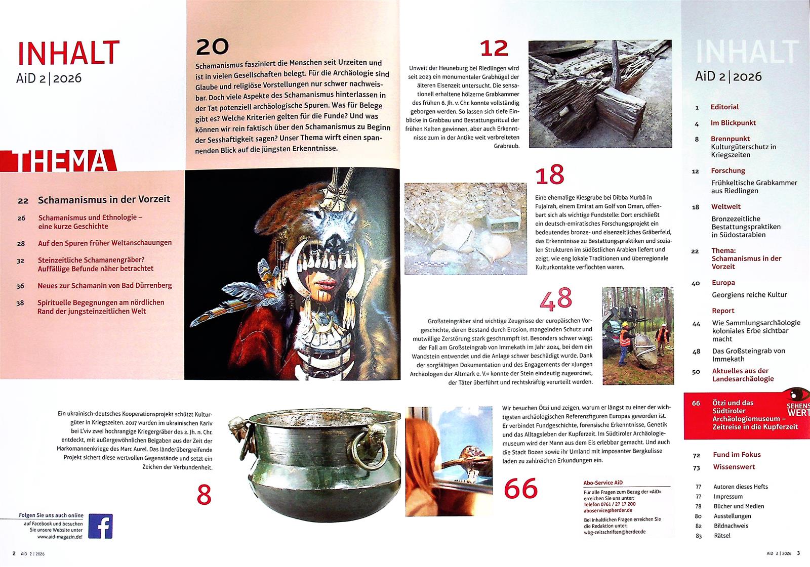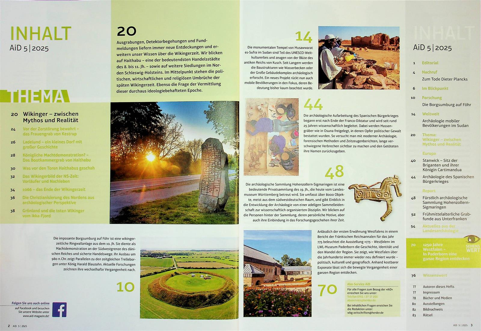 Neben einem thematischen Schwerpunkt in jedem Heft beleuchtet die AiD mit den regelmäßig erscheinenden Rubriken Forschung, International, Brennpunkt, Reportagen, Nachrichten und dem Fenster Europa sämtliche Aspekte des archäologischen Spektrums. Im umfassenden Teil „Aktuelles aus der Landesarchäologie“ finden Sie Berichte über die neuesten Entwicklungen vor Ihrer Haustür.
