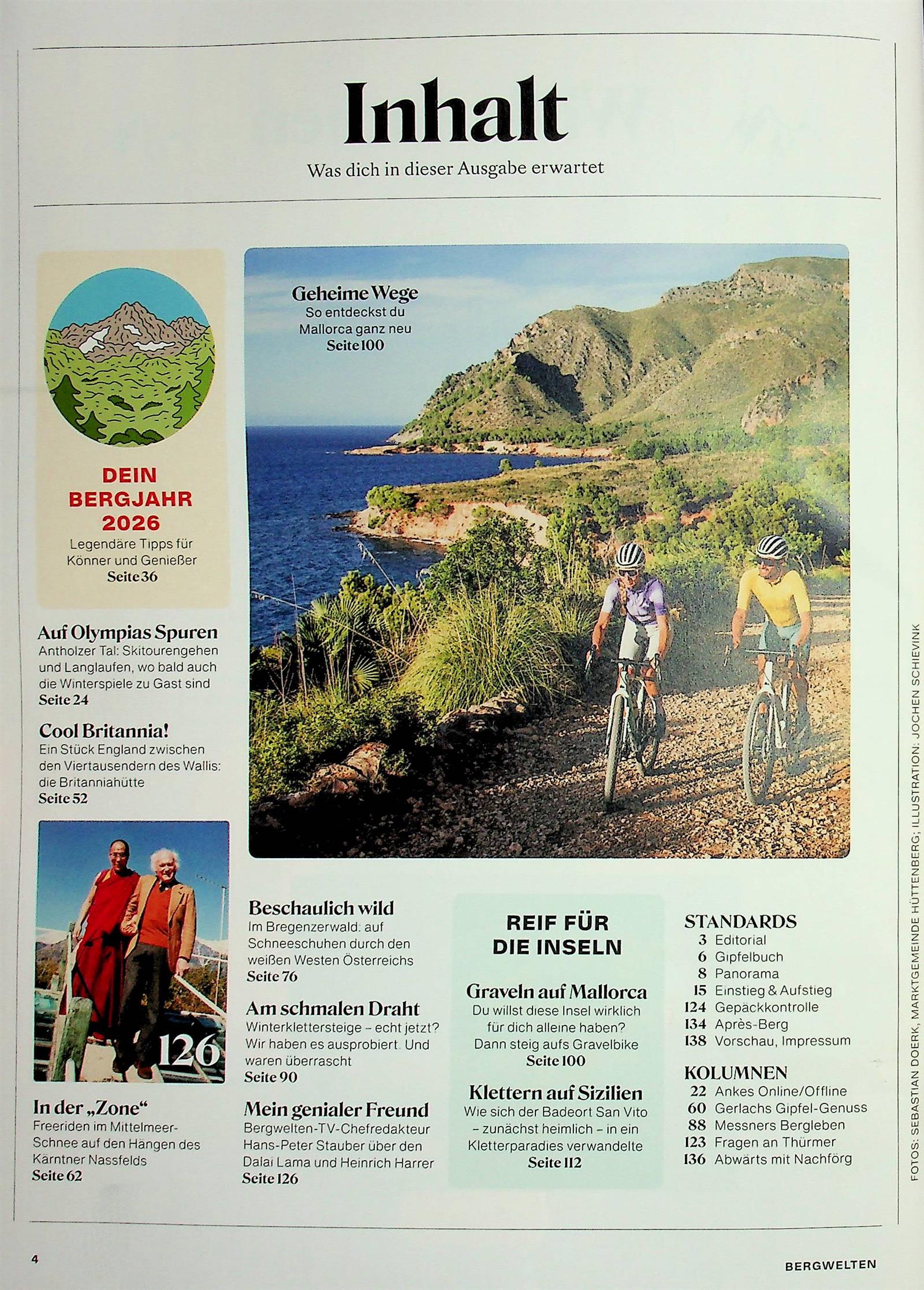 Richtig sportlich in den Bergen unterwegs – das ist eine weitere Spezialität des Magazins. In Reportagen werden Kletter- und Bike-Touren vorgestellt, der Leser erfährt, wie man mit dem Kajak oder dem Paraglider in den Alpen unterwegs ist. Mit dabei sind oftmals bekannte Profis, die aus ihrem Metier berichten.