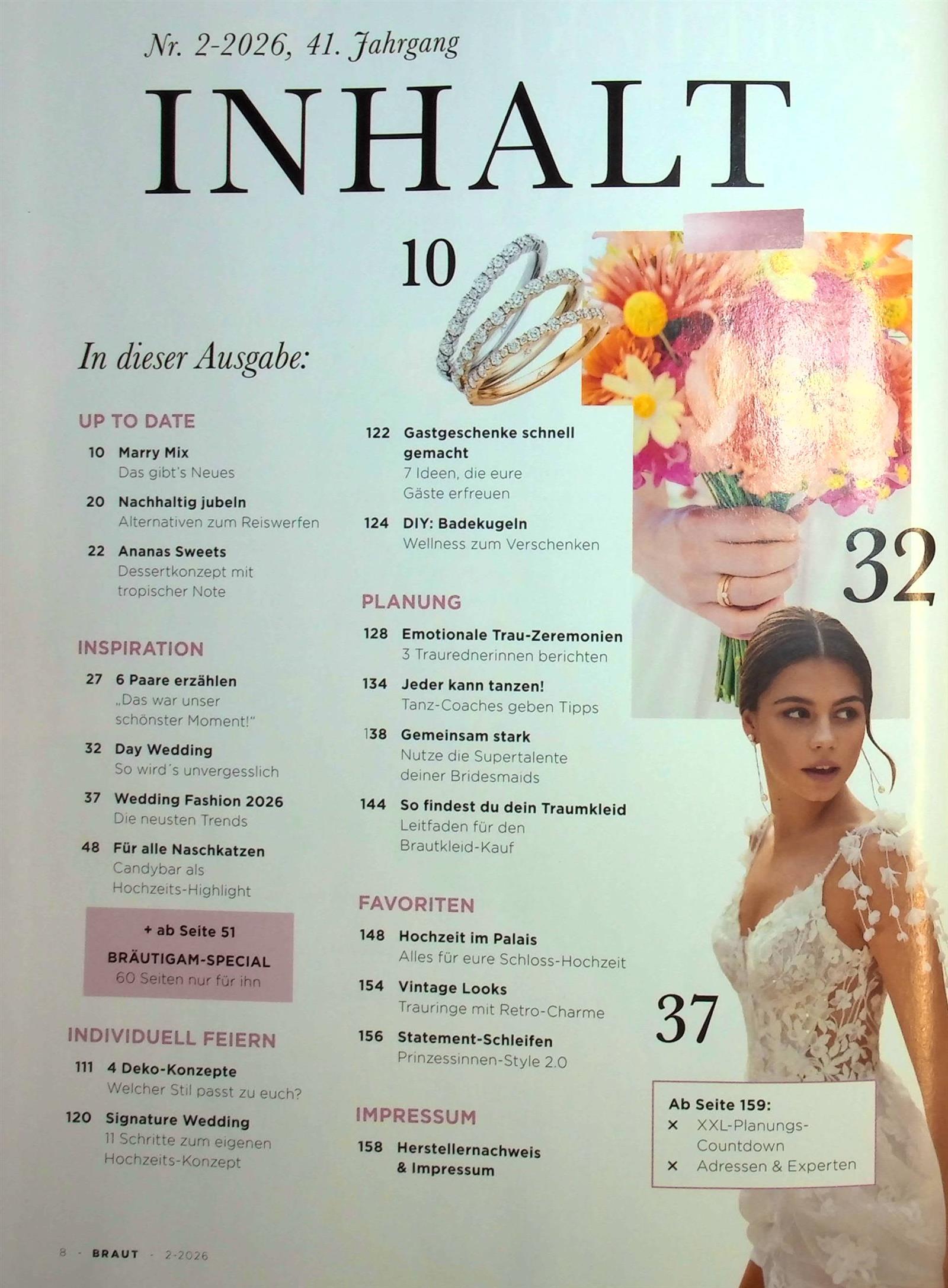 Braut & Bräutigam ist die Zeitschrift für Heiratswillige, die auf der Suche nach wertvollen Tipps sind. Auf mehr als 150 Seiten werden sämtliche Facetten des vermeintlich schönsten Tag des Lebens abgehandelt sowie regional zugeschnittene Empfehlungen für passende Räumlichkeiten, Kleidung, Dekoration und vieles mehr gegeben. Dabei finden sich immer wieder Specials als umfangreiche Beilagen, die dann unter anderem Themen wie die Auswahl der passenden Trauringe behandeln.