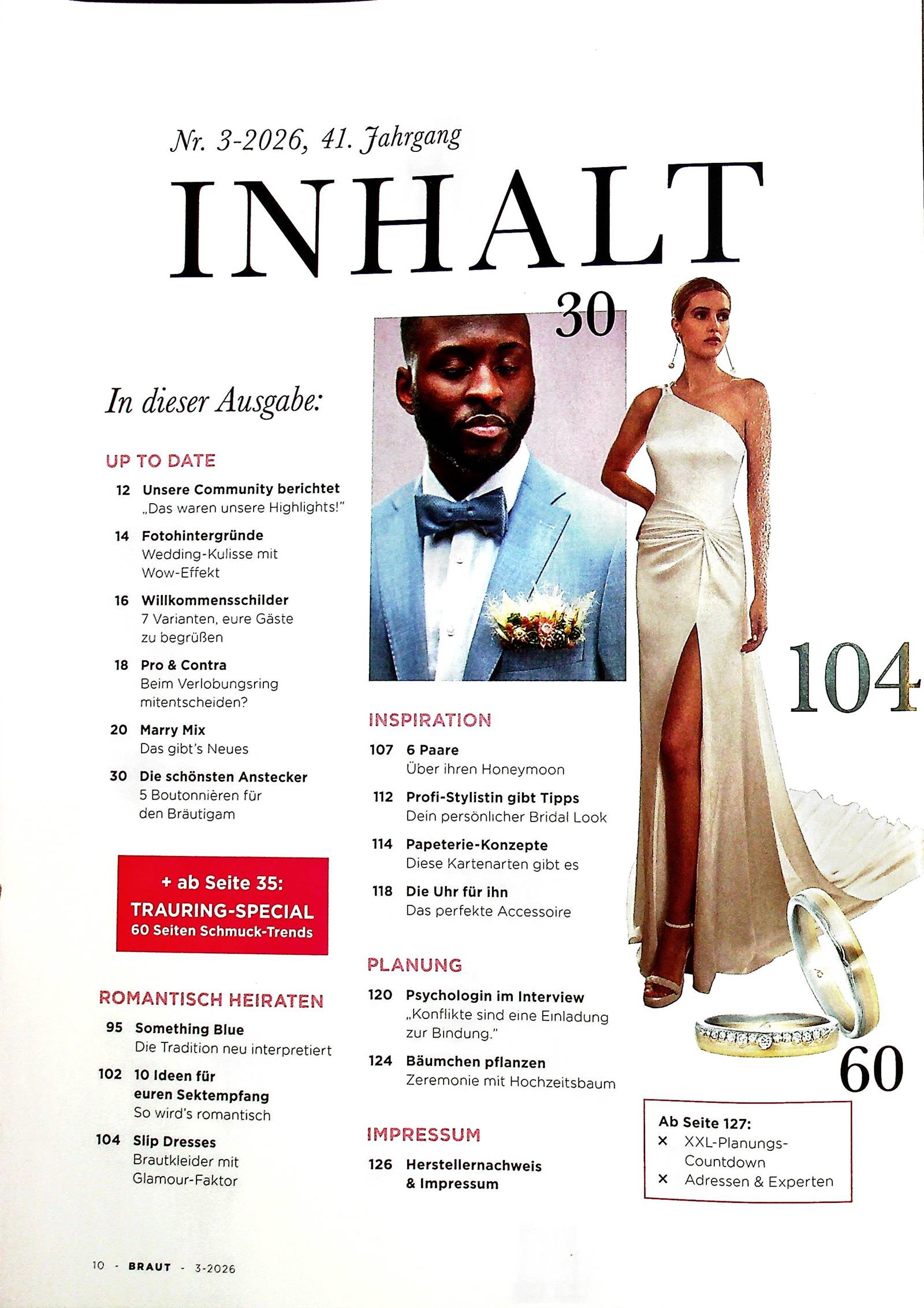 Braut & Bräutigam ist ein Magazin, bei dem sich alles rund um das Heiraten dreht. Publiziert wird in verschiedenen Regionalausgaben und das bereits seit 1985. Braut & Bräutigam erscheint im Abstand von zwei Monaten.
