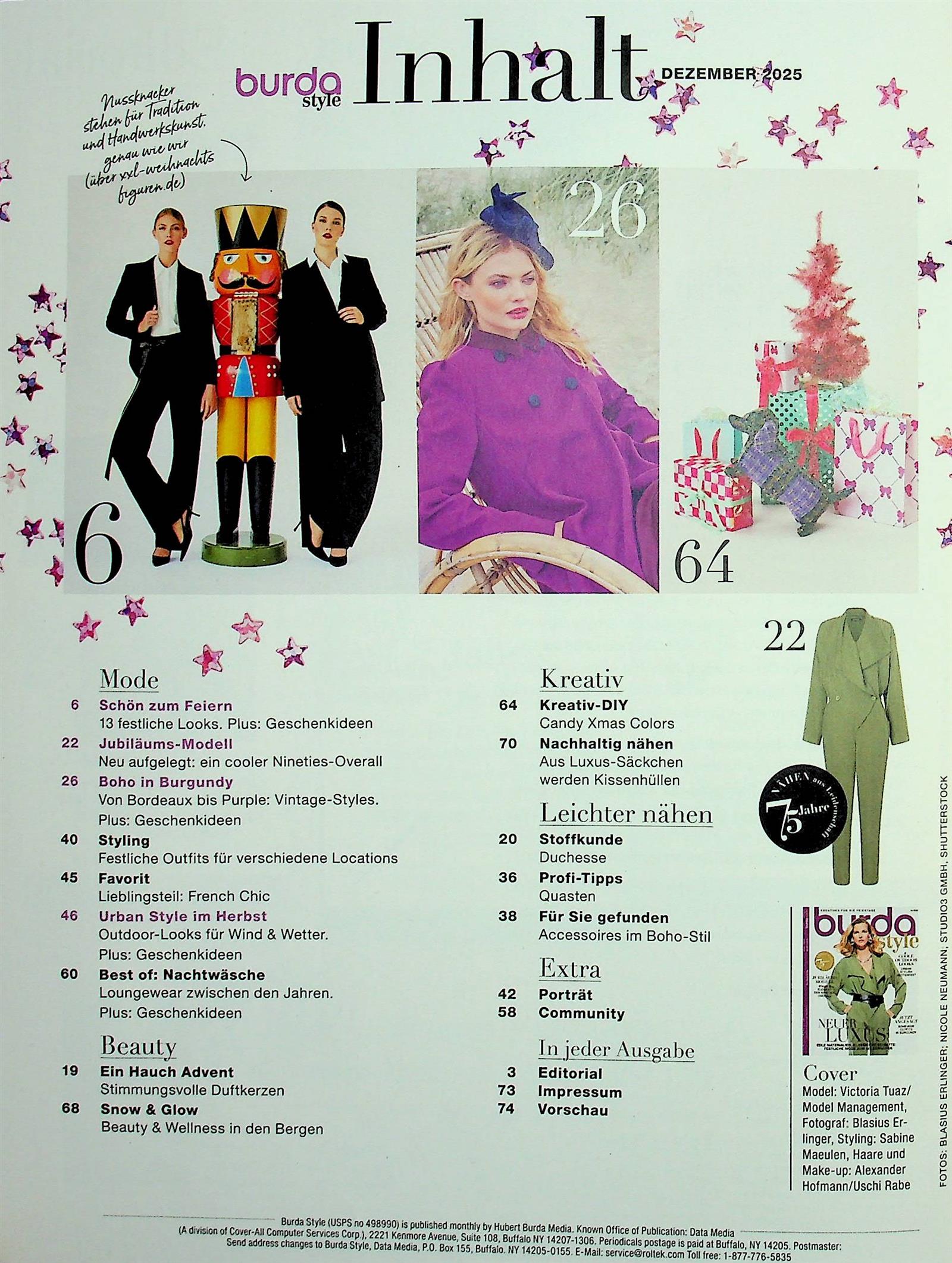 Ein Statement für Mode, Stilberatung, Nähen, Schnittmuster und DIY-Know-how – Burda Style zählt zu den weltweit meistgelesenen Mode- und Nähzeitschriften. Mit ihren Inspirationen steht sie für Kreativität, Individualität und Persönlichkeit abseits der Kleidung von der „Stange“. Sie ist ein Modemagazin zum Mitmachen. Anleitungen für verschiedene Arten von Handarbeiten – Schwerpunkt Nähen – machen Lust, gleich loszulegen. Damit es auch immer funktioniert, sind alle Details in den Schnitten und Anleitungen akribisch notiert.