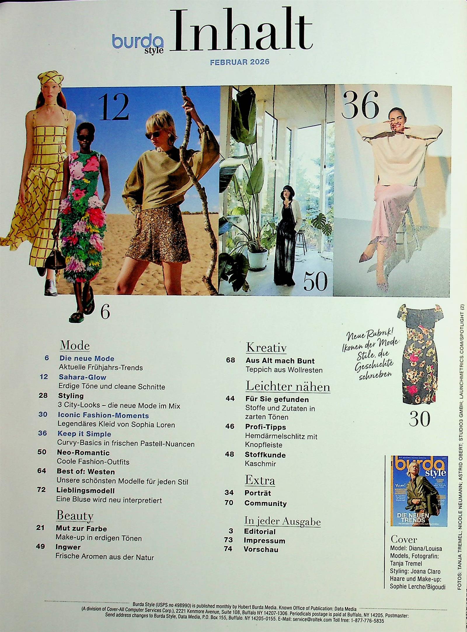 Heft 2/2023 , es gefällt mir. Das letzte Journal ,das ich gekauft hatte , war 9/2022. über die vielen Modelle in Übergröße war ich sehr irritiert, denn es gibt doch für Übergrößen Burda Curvy. Schön, dass an deren Stelle etwas für Herren angeboten wird, wenn auch nur sparsam. Ich selbst bin 81 Jahre, und trage immer noch Größe 36/38. Gerne werde ich das neugestaltete Journal wieder kaufen. Grüße aus Frankfurt am Main
