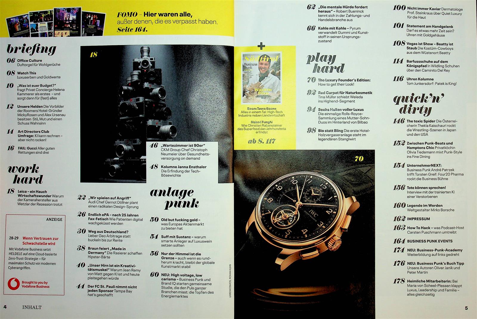 “Work hard, play hard“ – so lautet das Motto der Business Punk. Gemeint ist, dass auf der einen Seite Geschäftsideen oder neue –modelle gezeigt werden, aber auch die angenehmen Aspekte des Lebens nicht zu kurz kommen. So finden sich beispielsweise Artikel über Start-Ups und deren Unternehmenskultur sowie Businessmodell aber auch Anregungen aus den Bereichen Mode, Film und Musik in dem Heft. Auf der Titelseite werden meist Innovatoren aus der Branche abgebildet und deren Story erzählt, doch finden sich auch kleinere Artikel und News.