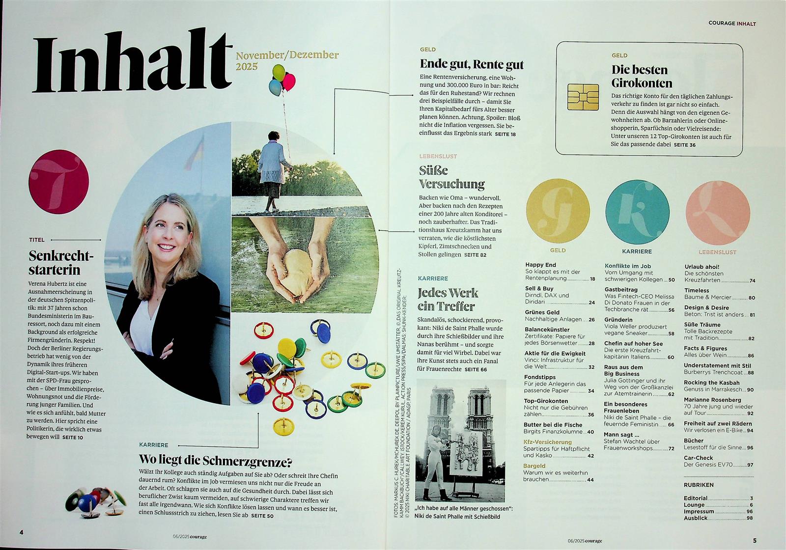 Aufgeteilt in drei Ressort – Geld, Karriere, Lebenslust – kommt das Magazin Courage daher und präsentiert eine Themenauswahl, die insbesondere Frauen ansprechen möchte. Clevere Spar- und Steuertipps, umfangreiche Tests von Versicherungen, sinnvolle und doch einfache Anlagestrategien dazu in jeder Ausgabe der Courage ein „Absicherungsschwerpunkt“ – von Patientenverfügung bis Berufsunfähigkeitsversicherung. Das Ressort Geld greift Finanzthemen zu jeder Lebenslage auf und gibt aussagekräftige Antworten.