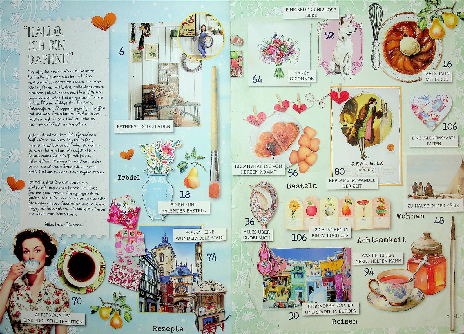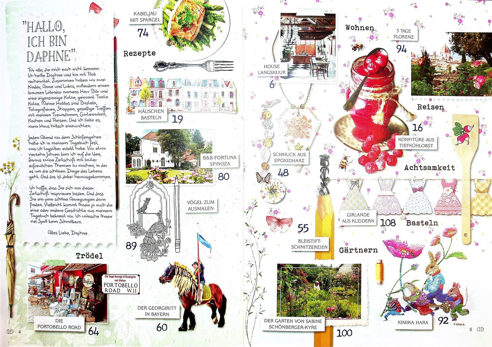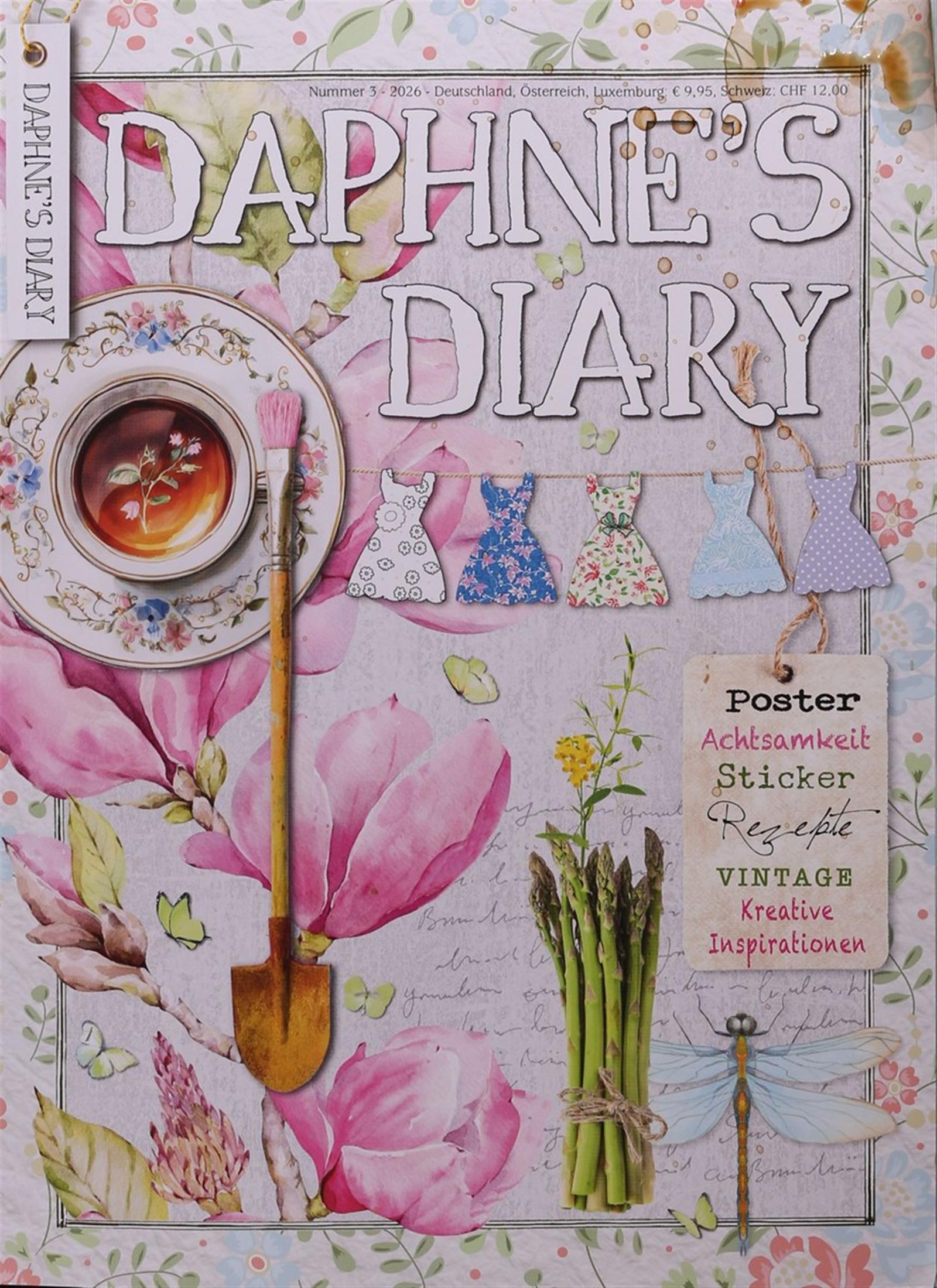 Jede Ausgabe von Daphne’s Diary ist eine Überraschung für die Leserinnen und Leser, eine Quelle der Inspiration, um das Leben und sein eigenes Zuhause hübsch einzurichten. Von leckeren Rezepten und Do-it-yourself-Tipps über Reiseerlebnisse, Anregungen Haus und Garten bis hin zu Themen wie Vintage und Achtsamkeit ist alles dabei. Dazu gibt es regelmäßige Rezensionen interessanter Bücher sowie Portraits von Modedesignern, die sich dem Vintage-Style widmen. Daphne’s Diary ist inzwischen nicht nur eine Zeitschrift, sondern eine ganz eigenständige Marke mit Website sowie diversen Internetkanälen auf Facebook, Instagram, Twitter und Pinterest. Die Website bietet neben vielen Downloads auch Daphne’s Shop, in dem interessierte Leser Bastel-Sets, Geschenkpakete, Kalender & Notizbücher, Briefpapier, Postkarten, Aufkleber, Bücher, Poster und vieles mehr bestellen können.