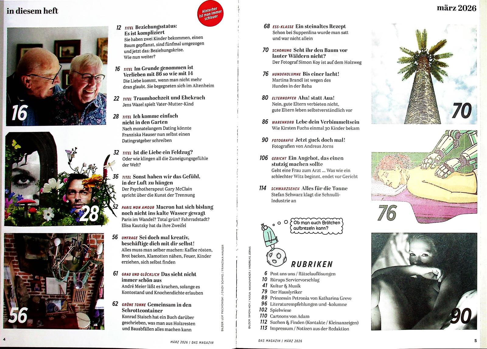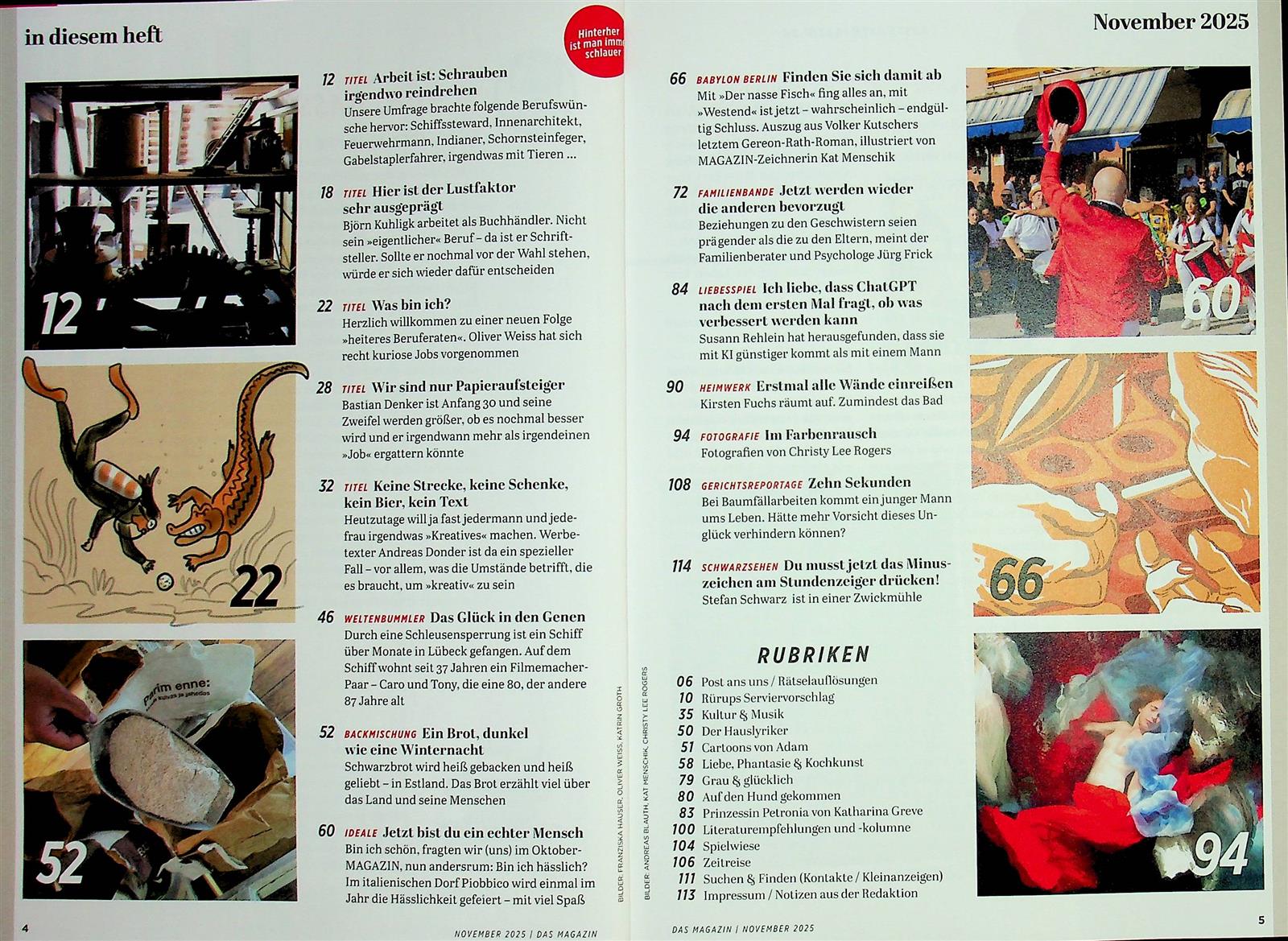 Die Novemberausgabe 2025 lädt ein in den „Traumjob-Zirkus“ und widmet sich dem Titelthema „Berufswunsch: Irgendwas mit Tieren“ – einem augenzwinkernden Blick auf Arbeitsträume zwischen Ideal und Realität. Dazu schreiben Susann Rehlein über künstliche Intelligenz als besseren „Jochen“, Stefan Schwarz über die Notwendigkeit, nicht zu schweigen, und Kirsten Fuchs über den Mut, „alle Wände einzureißen“.