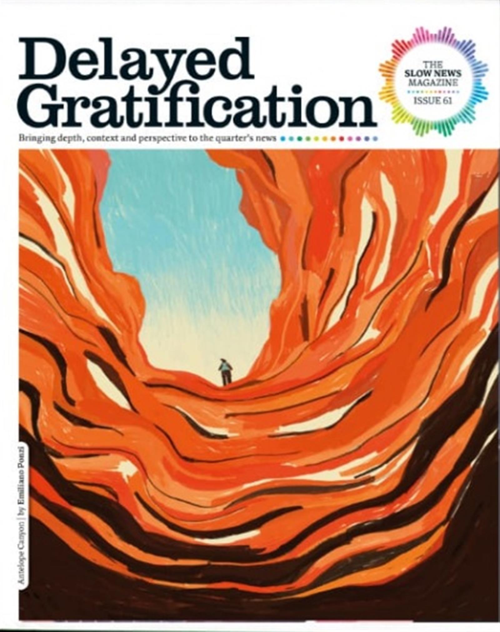 Leser*innen, für die Infotainment und Breaking News zu viel, zu laut, zu sensationsheischend sind, können sich mit diesem Heft erholen und informieren, einzigartige Geschichten und langsamen Journalismus, das Markenzeichen der Delayed Gratification, im besten Sinn genießen. Das Cover jeder Ausgabe wird von einem internationalen Künstler gestaltet, auf Papier, Design und Haptik wird genauso Wert gelegt wie auf die Inhalte, sodass Delayed Gratification ein intellektuelles und ein ästhetisches Vergnügen gleichzeitig darstellt.