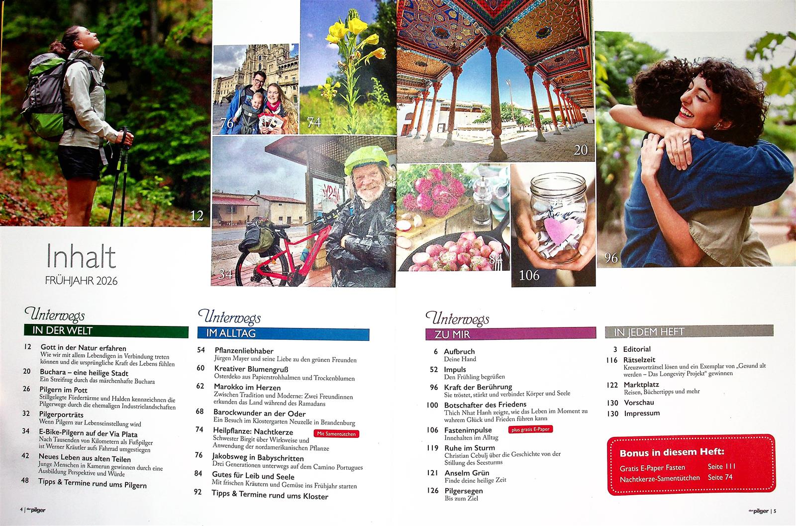Bei allen Themen bleibt Der Pilger authentisch, herzenswarm und schafft es gleichzeitig, unterhaltend und sinnstiftend zu sein. In der Rubrik „Tipps und Termine“ finden Sie in regelmäßigen Abständen Hinweise auf Veranstaltungen und Angebote aus dem breiten Spektrum dieses Magazins: Pilgern und Reisen, Schöpfung und Natur, Gesundheit und bewusstes Leben und Feste im Jahreskreis