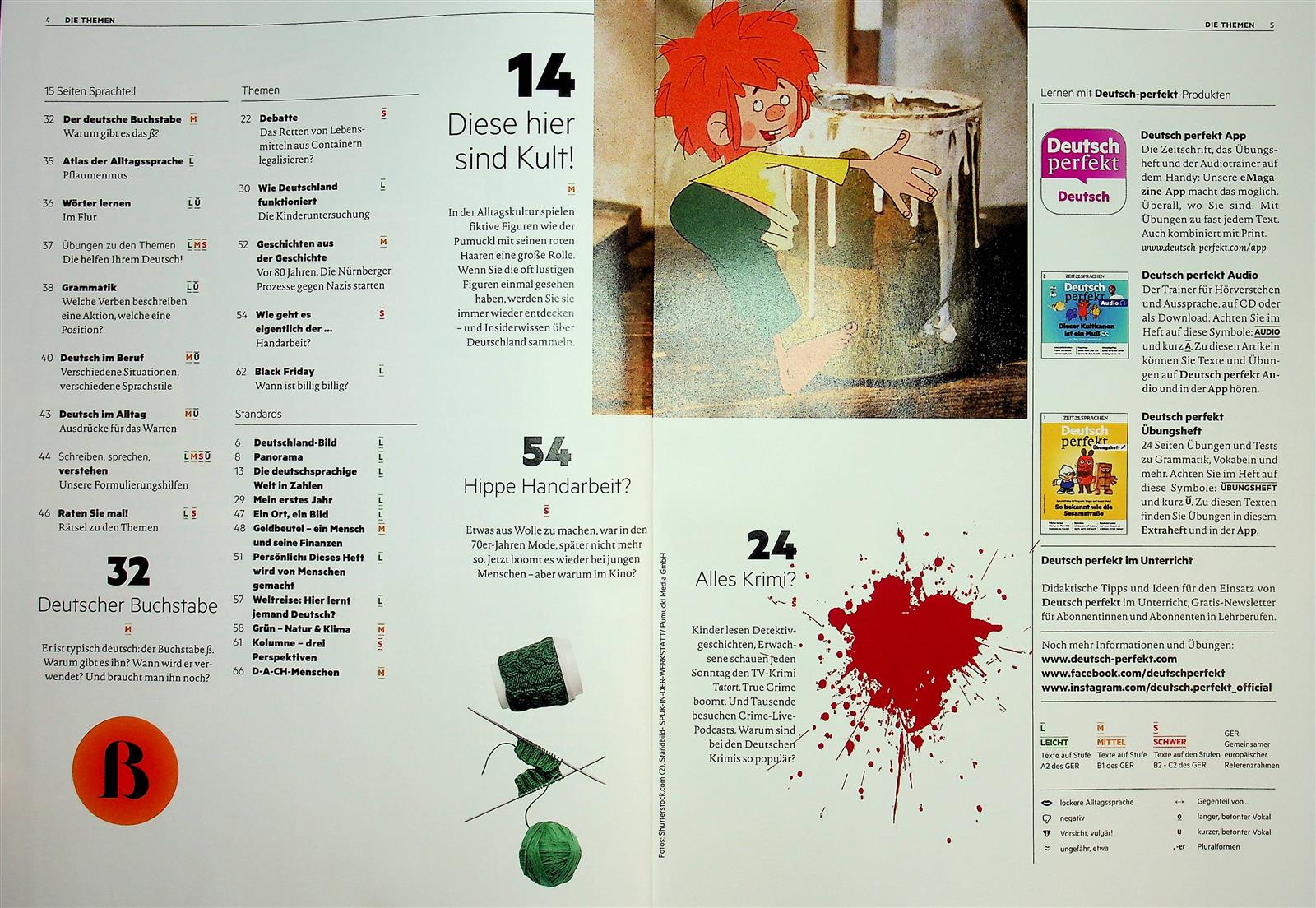 Genau genommen, ordnen sich die Inhalte in der Deutsch Perfekt dem Spracherwerb unter. Konkret bedeutet dies, dass auf rund 80 Seiten das didaktische Konzept „Deutsch als Fremdsprache“ Anwendung findet. Die einzelnen Artikel sind zum Teil in einfachem Deutsch geschrieben, komplizierte Begriffe werden zudem in einer Art Glossar erläutert und darüber hinaus in der Rubrik „Starthilfe“ ins Englische, Spanische, Französische, Italienische, Türkische, Polnische und Russische übersetzt. Flankiert wird die Deutsch Perfekt durch regelmäßig erscheinende Übungshefte und Audio–Produkte.