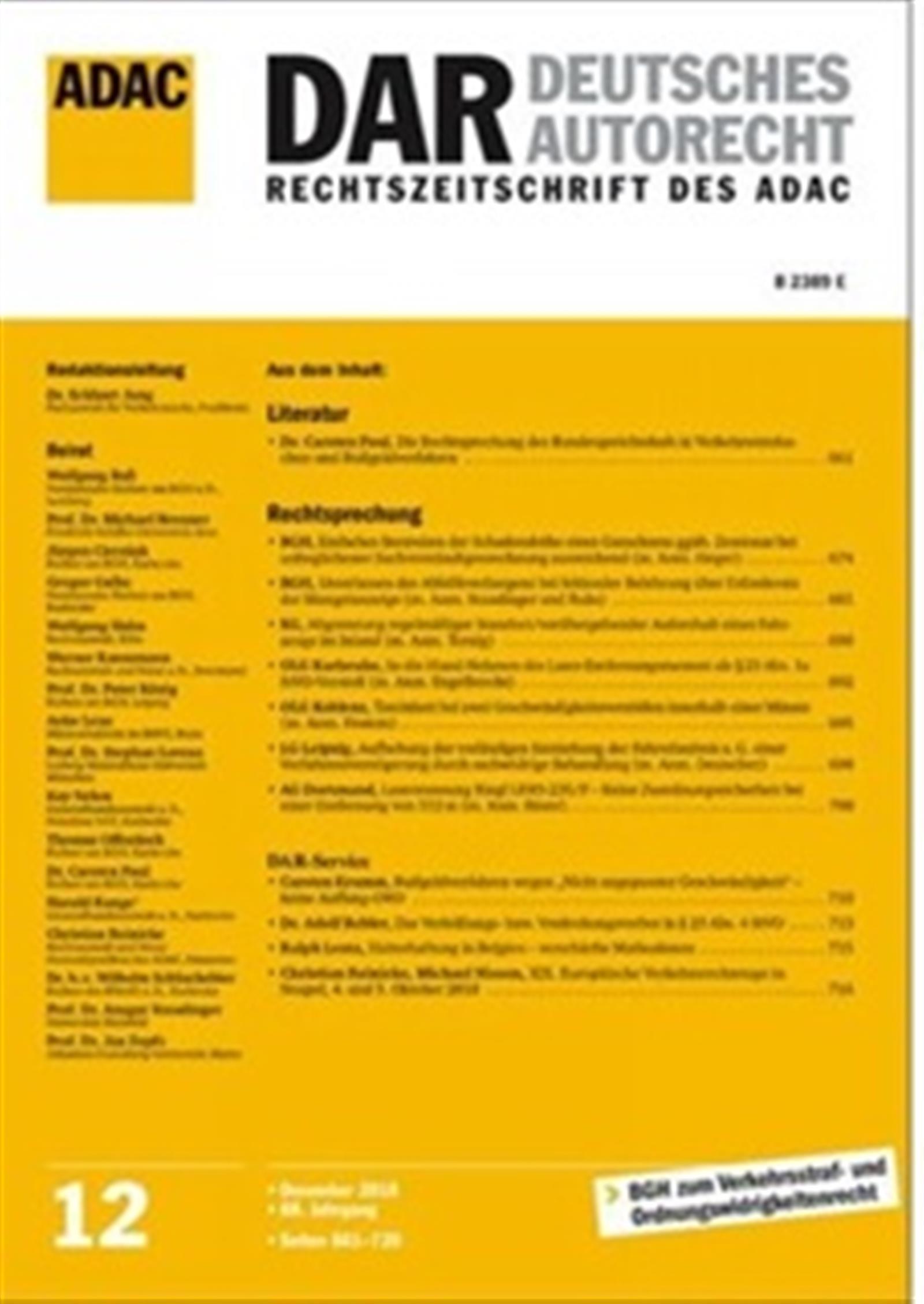 Das DAR bietet dem Leser jeden Monat auf 60 Seiten einen umfassenden Überblick zu Rechtsprechung und neuesten Entwicklungen im Verkehrsrecht, Haftungsrecht, Verbraucherschutzrecht, Internationalen AutoRecht.