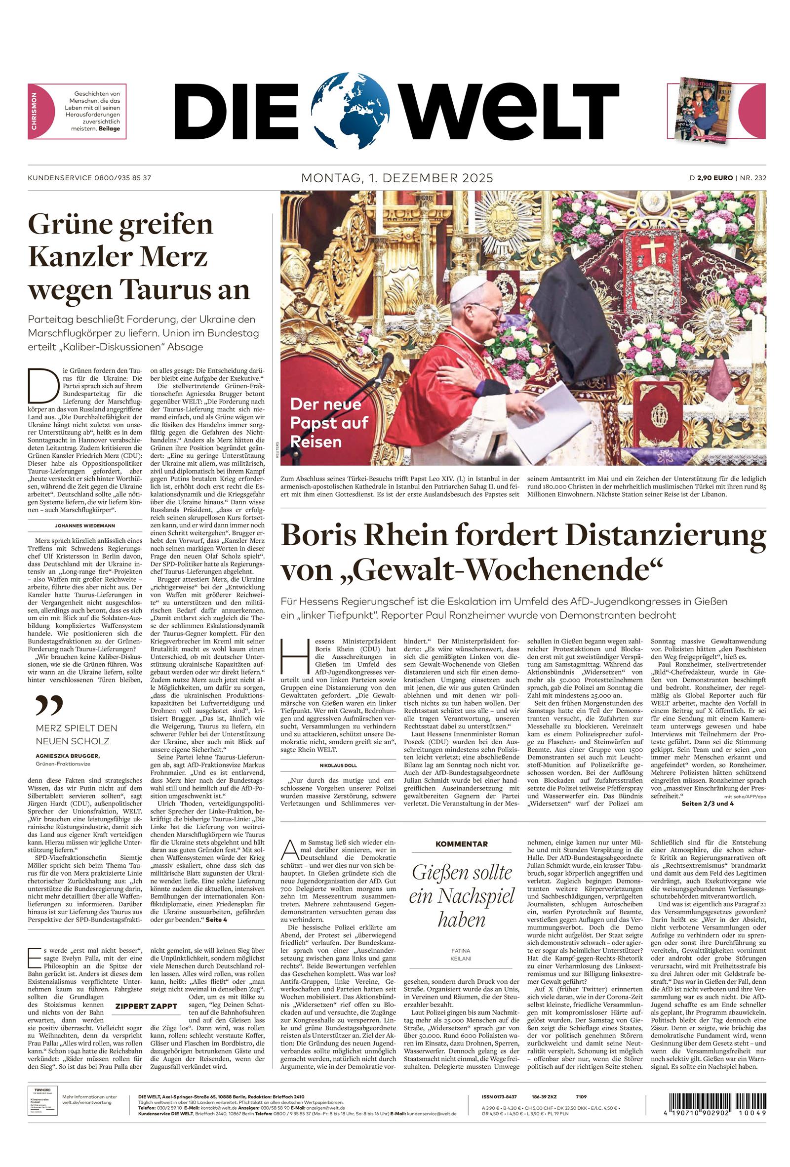 Die Zeitung DIE WELT ist eine moderne Tageszeitung mit großen, sorgfältig recherchierten Themen und ausführlichen Kommentaren. Das renommierte Blatt ist in die Ressorts Politik, Wirtschaft, Finanzen und Feuilleton unterteilt und bietet seinen Leser*innen klar strukturierte Nachrichten, Analysen und Einschätzungen. DIE WELT ist eine der führenden Zeitungen Europas und wird dennoch als bodenständig und geradlinig beschrieben. Tagesaktuell relevante Nachrichten aus der ganzen Welt, ihre Verlässlichkeit und die Vielfältigkeit der Themen sind weitere Gründe für die Beliebtheit dieser klassischen Tageszeitung.