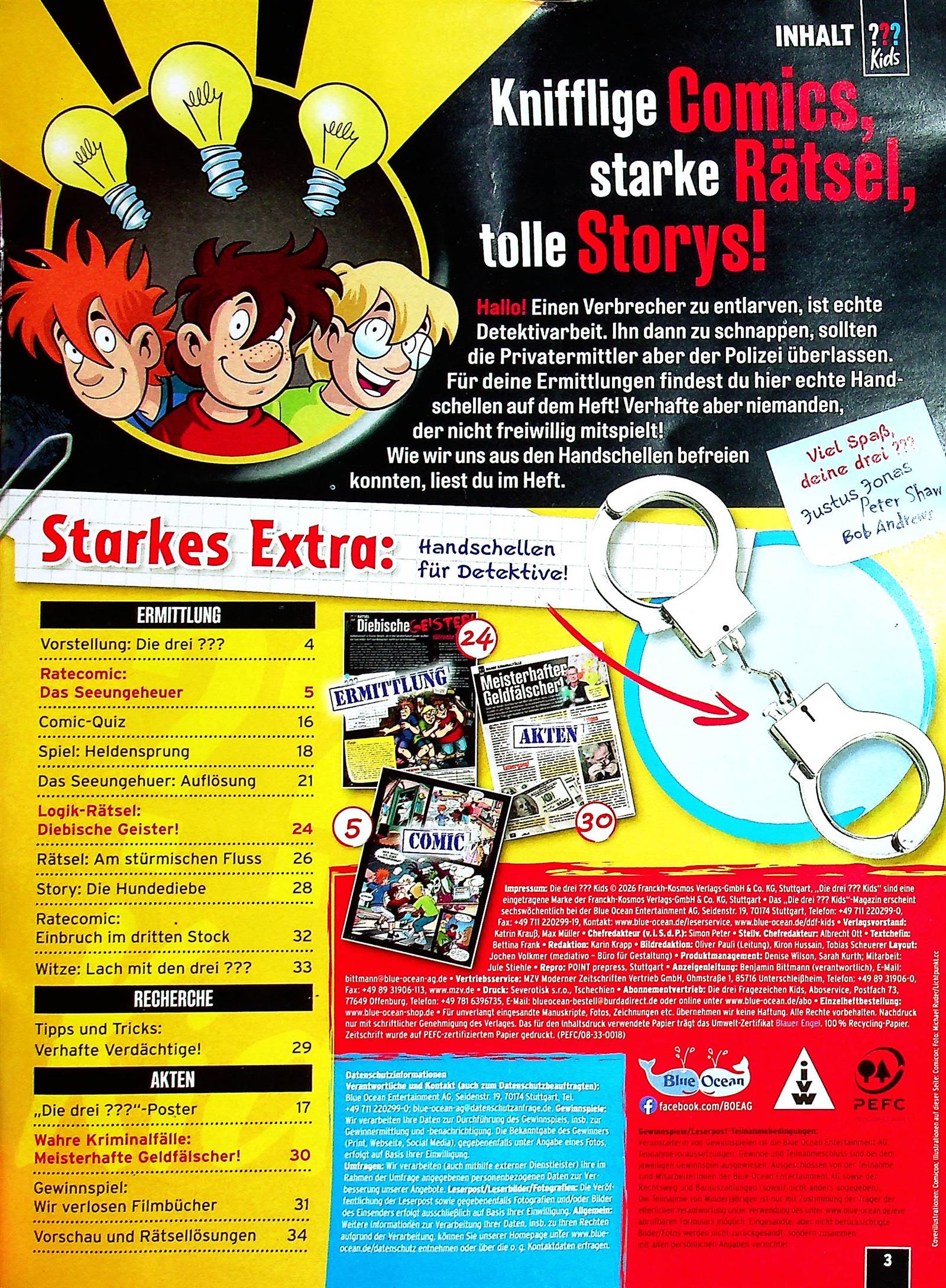 Knifflige Comics, starke Rätsel und spannende Storys rund um Die drei ??? Kids. Leser:innen werden selbst zu Ermittlern, lösen Logikrätsel, Ratecomics und Quizfragen und tauchen in geheimnisvolle Fälle ein. Mit dabei sind Detektivspiele, witzige Extras, echte Handschellen zum Miträtseln sowie packende Geschichten von Hundedieben, Geldfälschern und unheimlichen Erscheinungen. Eine Ausgabe voller Mitmachspaß, Köpfchen und kriminalistischem Abenteuer.