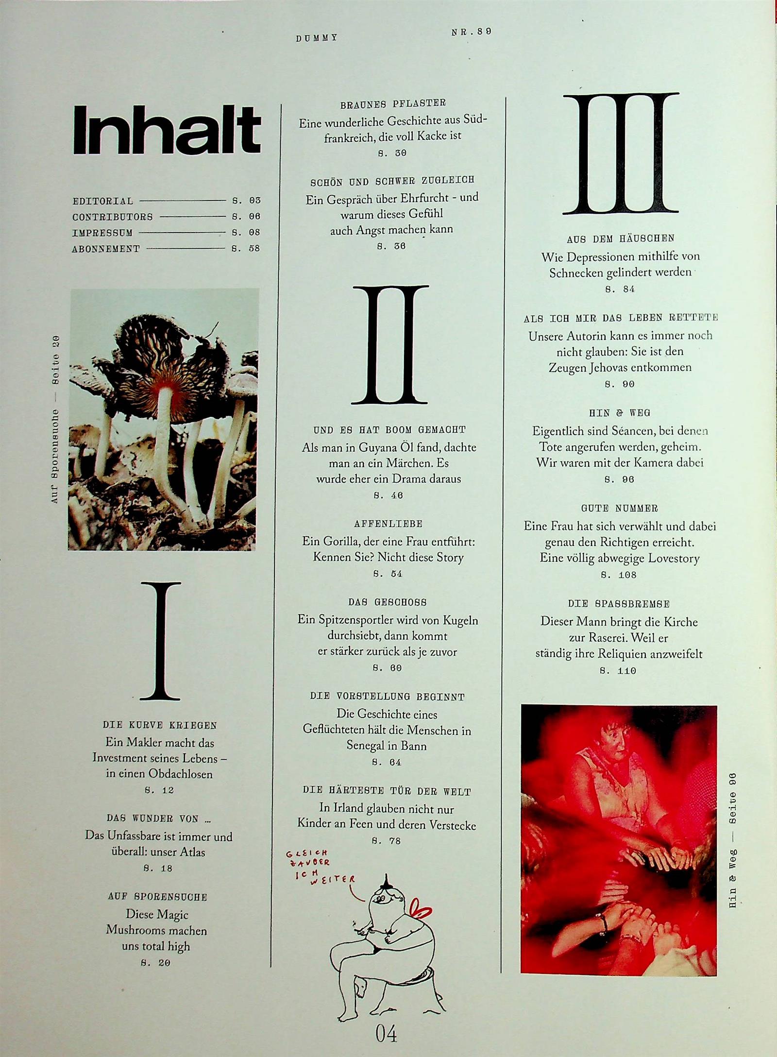 DUMMY ist ein aussergewöhnliches Magazin. Toller Mix von Bild und Text. Keine 08/15 Themen, mit Mut zu Kontroversen. Trotzdem nie unter der Gürtellinie, sondern mit Respekt gegenüber den porträtierten Menschen. Regt oft zum Nachdenken an. Vorbildlich!