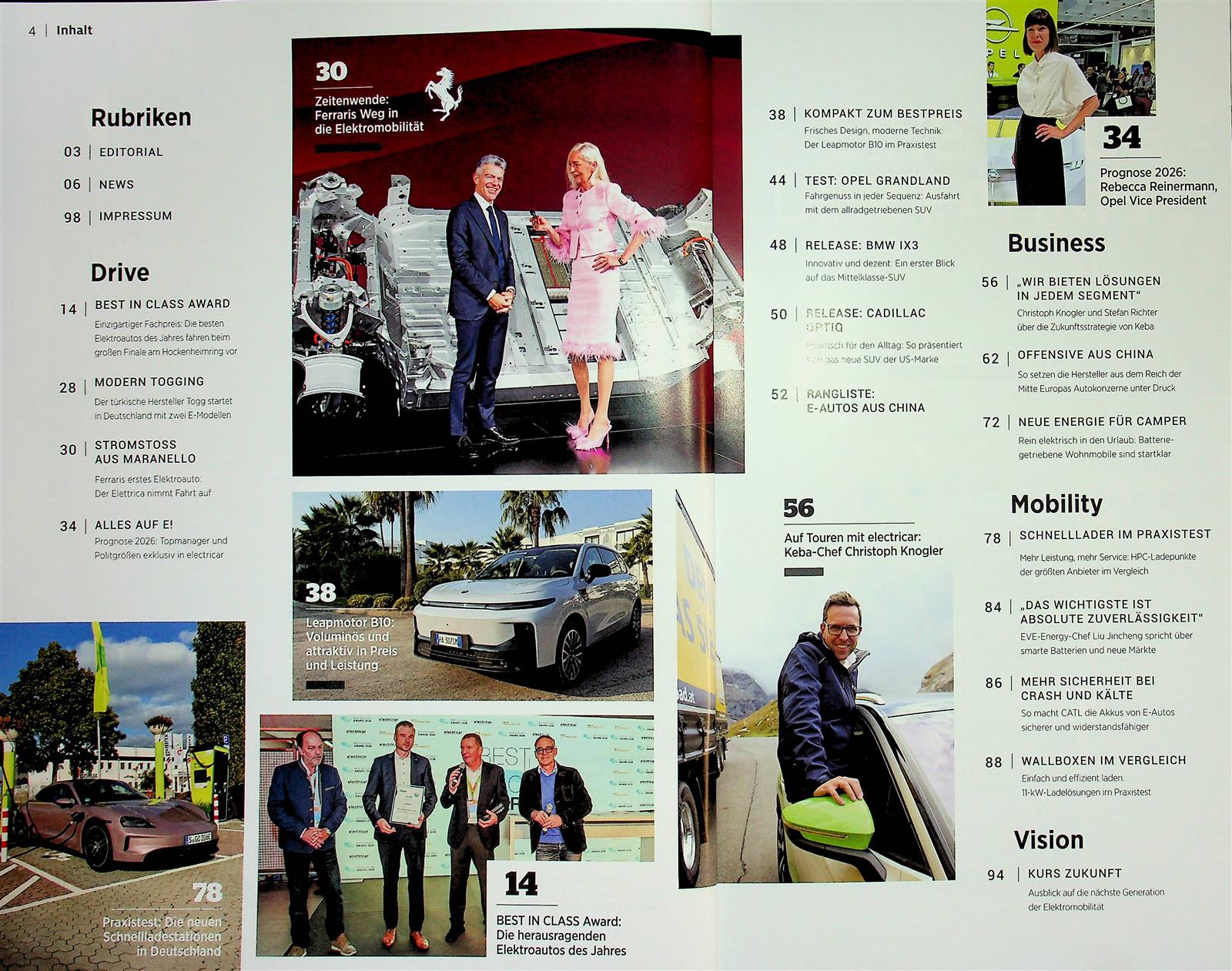 Das elegant designte Magazin widmet sich mit Passion dem Thema Elektromobilität und zeigt neben der heutigen Situation auch den Weg nach vorne an. Mit Analysen zu Lademöglichkeiten, Infrastruktur, staatlicher Förderung und steuerlicher Boni unterstützt die Redaktion Verantwortliche in vielen Unternehmen bei ihren Entscheidungen zur Einführung von Elektromobilität. Es werden Neuigkeiten von der Internationalen Automobil-Ausstellung präsentiert, es wird hinter die Fabriktore aller namhaften E-Auto-Hersteller geblickt und in ausführlichen Interviews Fragen zur Sicherheit der neuen Elektroautos nachgegangen. Von großen Unternehmern im Land will die Redaktion wissen, wie groß die Bereitschaft ist, das eigene Fahrzeugportfolio auf E-Mobilität umzustellen. Im Technikteil der ElectriCar werden die Fahrzeuge mit der größten Reichweite vorgestellt und selbstfahrende E-Autos getestet. Das Magazin leistet Aufklärungsarbeit in Sachen Fördermöglichkeiten und Vergünstigungen beim Kauf von Elektroautos und gibt den Leser*innen eine klare Übersicht an die Hand. Es wird außerdem in die Zukunft geblickt und verraten, welche neuen Modelle bei großen Herstellern wie Audi, Nissan, Tesla, BMW und Toyota gerade in der Pipeline sind. Zum Abschluss sorgt die magazineigene Rangliste aktueller E-Auto-Modelle bei ElectriCar noch für Überraschungen.