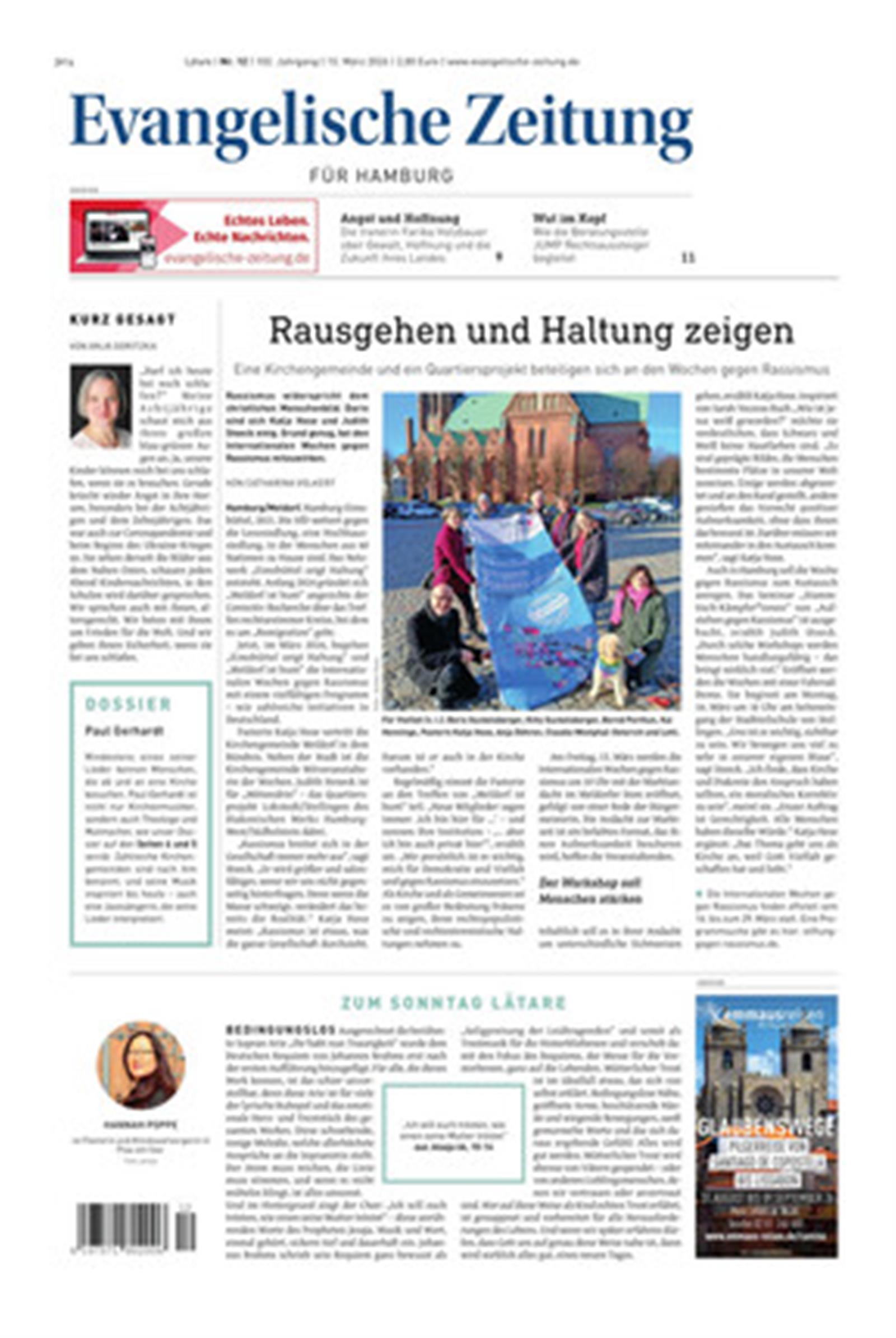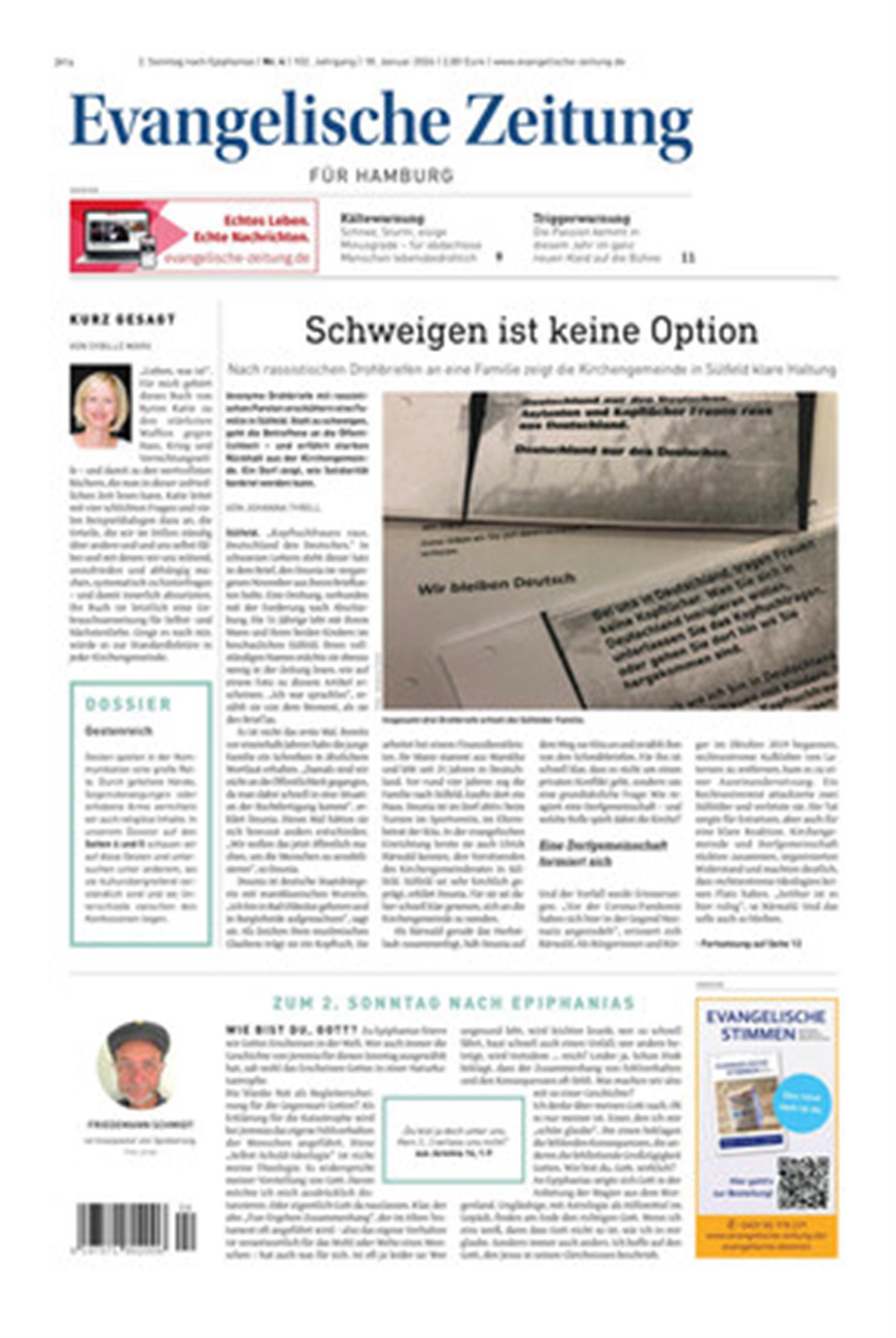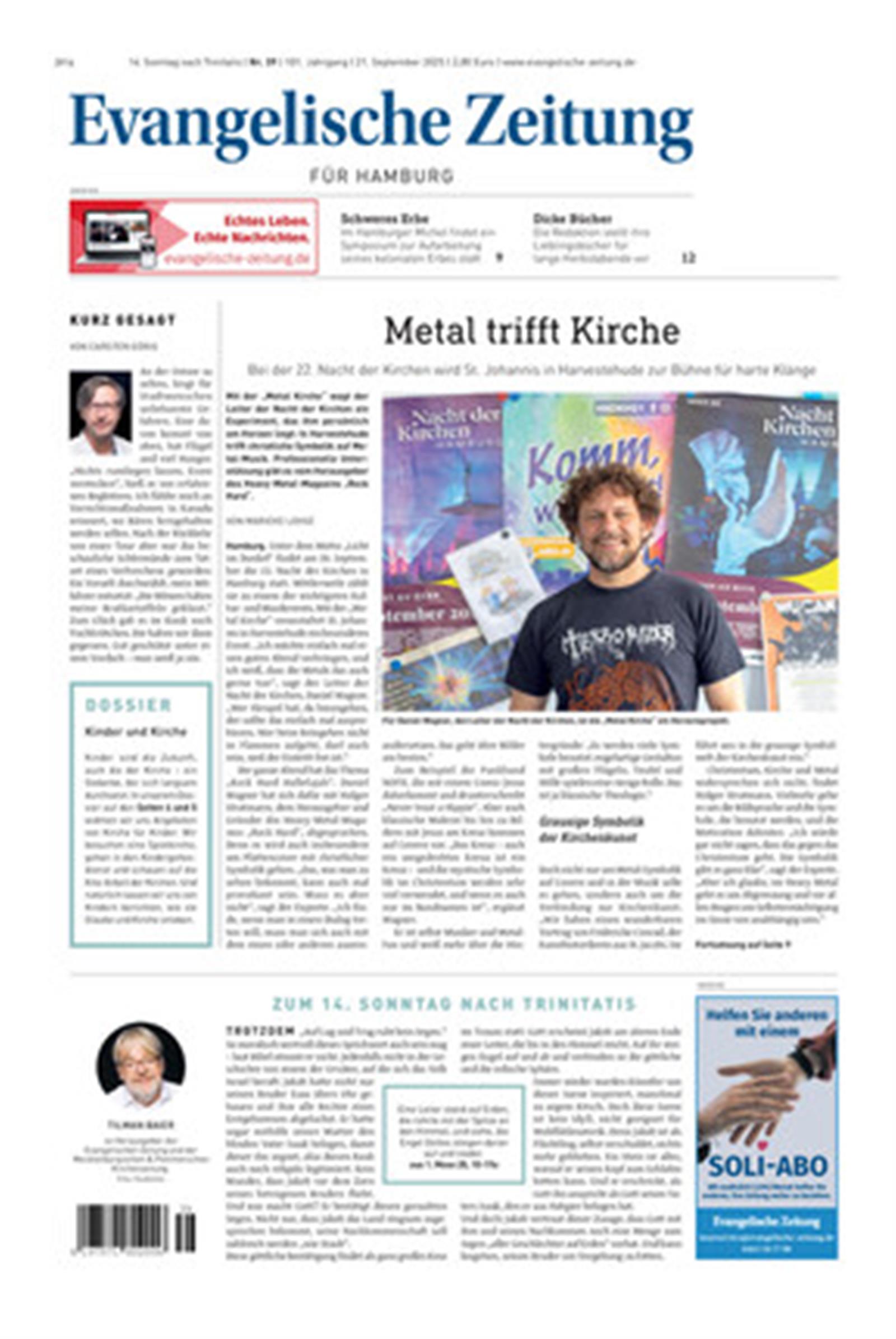 Die »Evangelische Zeitung« ist die einzige Wochenzeitung für Schleswig-Holstein (einschließlich Nordschleswig) sowie Hamburg und erscheint auch in den Landeskirchen von Hannover, Braunschweig und Oldenburg.