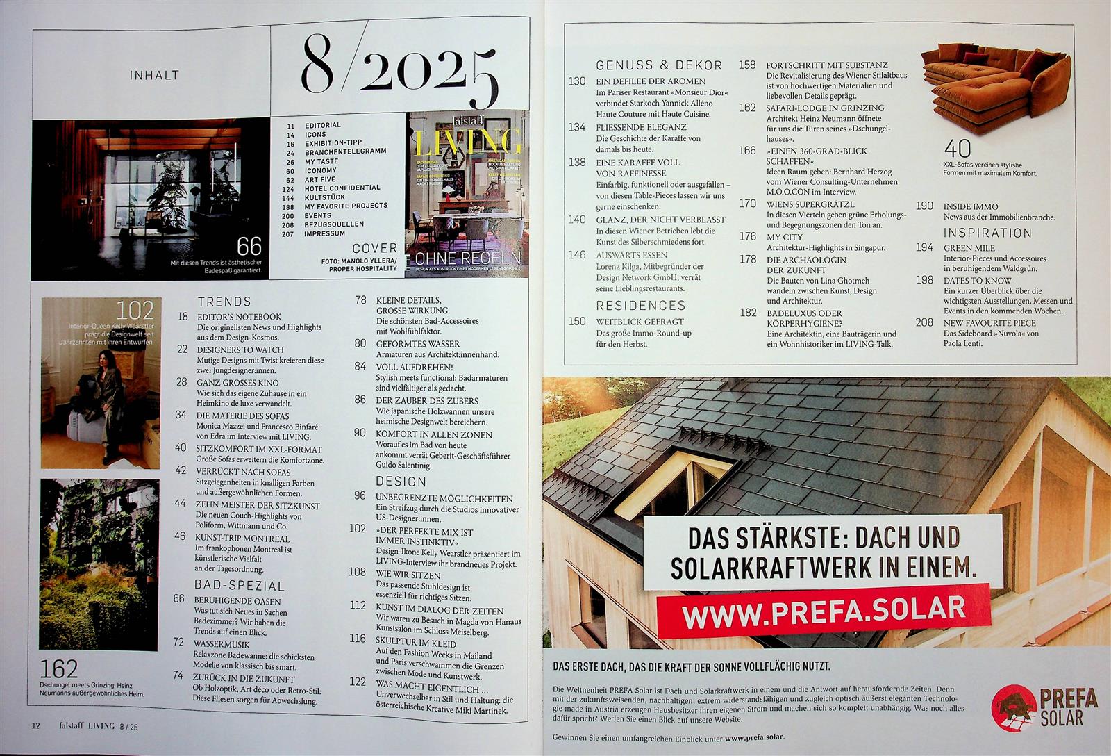 Falstaff Living ist ein besonders hochwertiges Magazin mit dem Schwerpunkt Architektur, Dekorationstrends sowie modernes und stilvolles Leben. Es ist voll von Tipps, Trends und Must-Haves für Ihr Zuhause. Mit Hochglanzdrucken und hochwertigen Fotografien bietet das Magazin seinen Lesern einen Augenschmaus und bündelt in seinen Artikeln auch aktuelle Dekorations- und Designtrends.