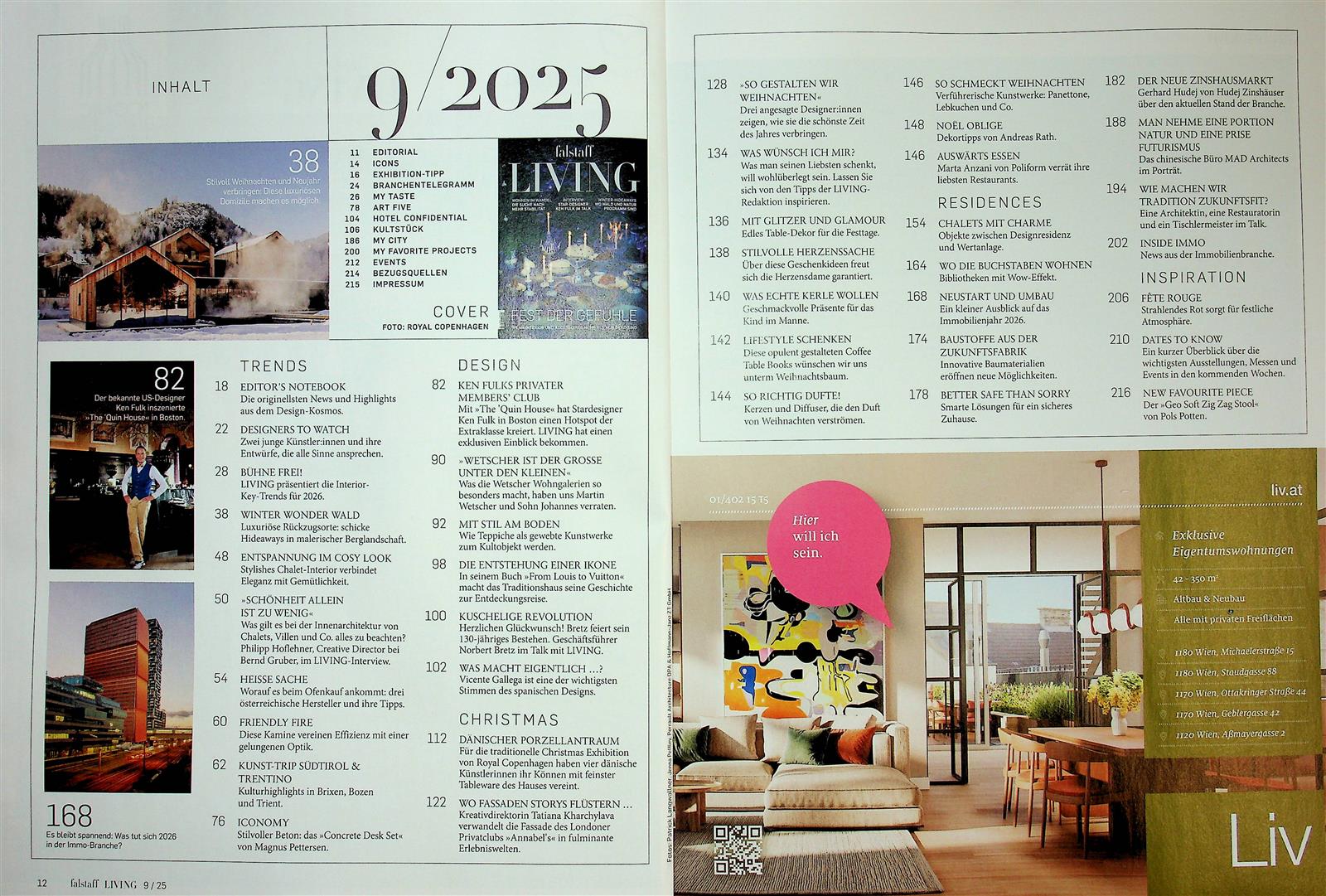 Falstaff Living ist ein Design- und Lifestyle-Magazin, das die Themen Interior-Trends, Design, Architektur und Immobilien umfasst. Das in Österreich ansässige Magazin ist nicht nur ein großartiger Stilberater und eine Inspirationsquelle, sondern auch ein Leitfaden für leidenschaftliche Experten in vielen Bereichen – wie Kunst, Architektur und Design –, die nach innovativen Analysen neuer Trends suchen. Insofern spielt es eine tragende Rolle bei der Bestimmung des Trends.