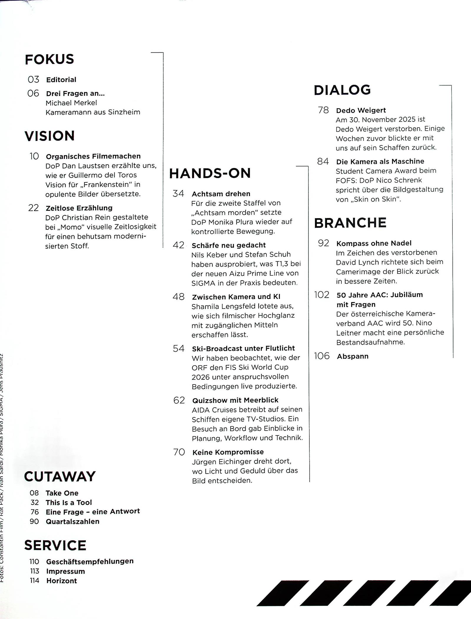 Seit 71 Jahren ist Film & TV Kamera das Fachmedium Nummer 1 in der Film- und Fernsehbranche. Er ist das Printmagazin mit der stärksten verkauften Auflage in diesem Segment. Wer Informationen aus der Filmproduktion, Filmtechnik, Licht, Tonausstattung, Broadcast, Doku, Postproduktion und Schnitt sowie kompakte Brancheninformationen will, abonniert Film & TV Kamera. Der Film- & TV-Hardwaremarkt hat sich in den letzten zehn Jahren grundlegend gewandelt, vom Ort weniger großer Player, zu einem Tummelplatz vieler kleiner und flexibler Unternehmen. Hier ist Film & TV Kamera eine wichtige Instanz, um aktuell, umfassend und zielgruppengenau über Aktuelles zu informieren. Unsere Autoren und Redakteure teilen ihr Fachwissen über neue Technologien, Grundlagen, Businessgeschehen und ihre Einschätzung aktueller Trends und Entwicklungen mit den Lesern: Kameramänner, Beleuchter, Tontechniker, Produzenten…