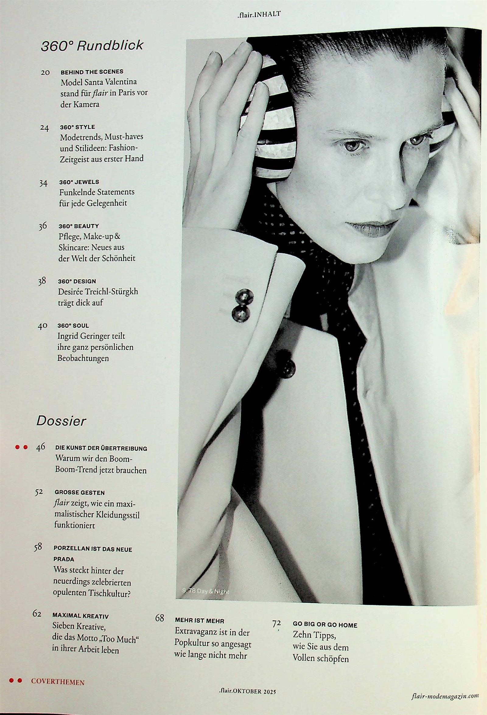 “Flair vereint die beiden großen weiblichen Leidenschaften Fashion & Home in einem Magazin. Denn so wie jedes Herz zwei Herzkammern hat, besitzt auch Flair zwei kreative Kernkompetenzen. Und den Anspruch, jeden Monat den Leserinnen die essentiellen Fashion-Trends aus den internationalen Mode-Metropolen zu präsentieren und gleichzeitig die schönsten Häuser, Wohnungen und Interieurs zu zeigen.“ meint Klaus Dahm, der Chefredakteur der Flair.