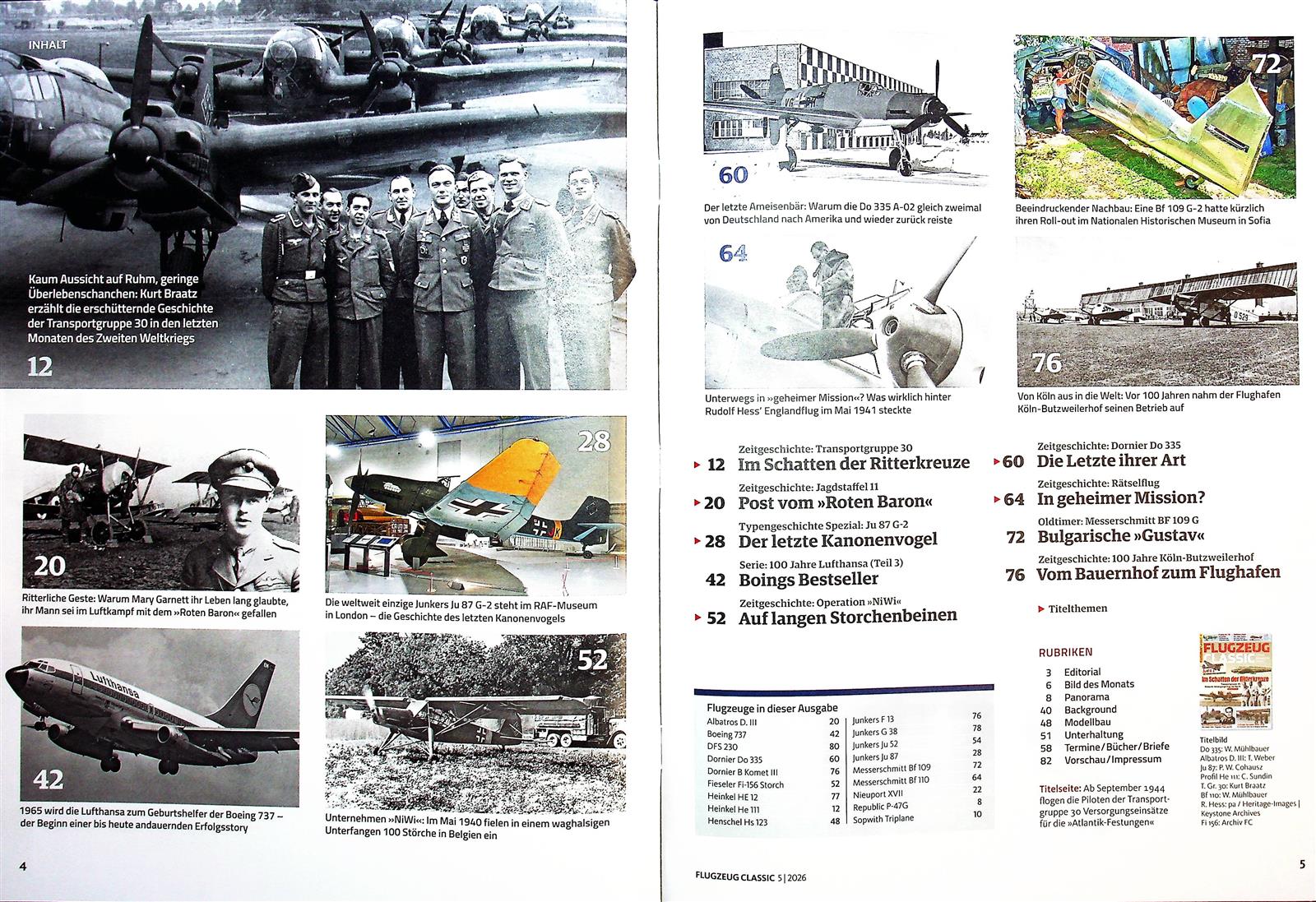 FLUGZEUG CLASSIC beinhaltet Reportagen, News und faszinierende Bilder. Das Magazin berichtet ausschließlich über Flugzeuge vergangener Jahrzehnte. Die erfolgreichsten Flugzeuge, Oldtimer-Airshows, Modelle und ihre Vorbilder sowie Pioniere der Luftfahrt werden reich illustriert und kenntnisreich vorgestellt. Ein großer Modell-Teil rundet das Magazin ab.