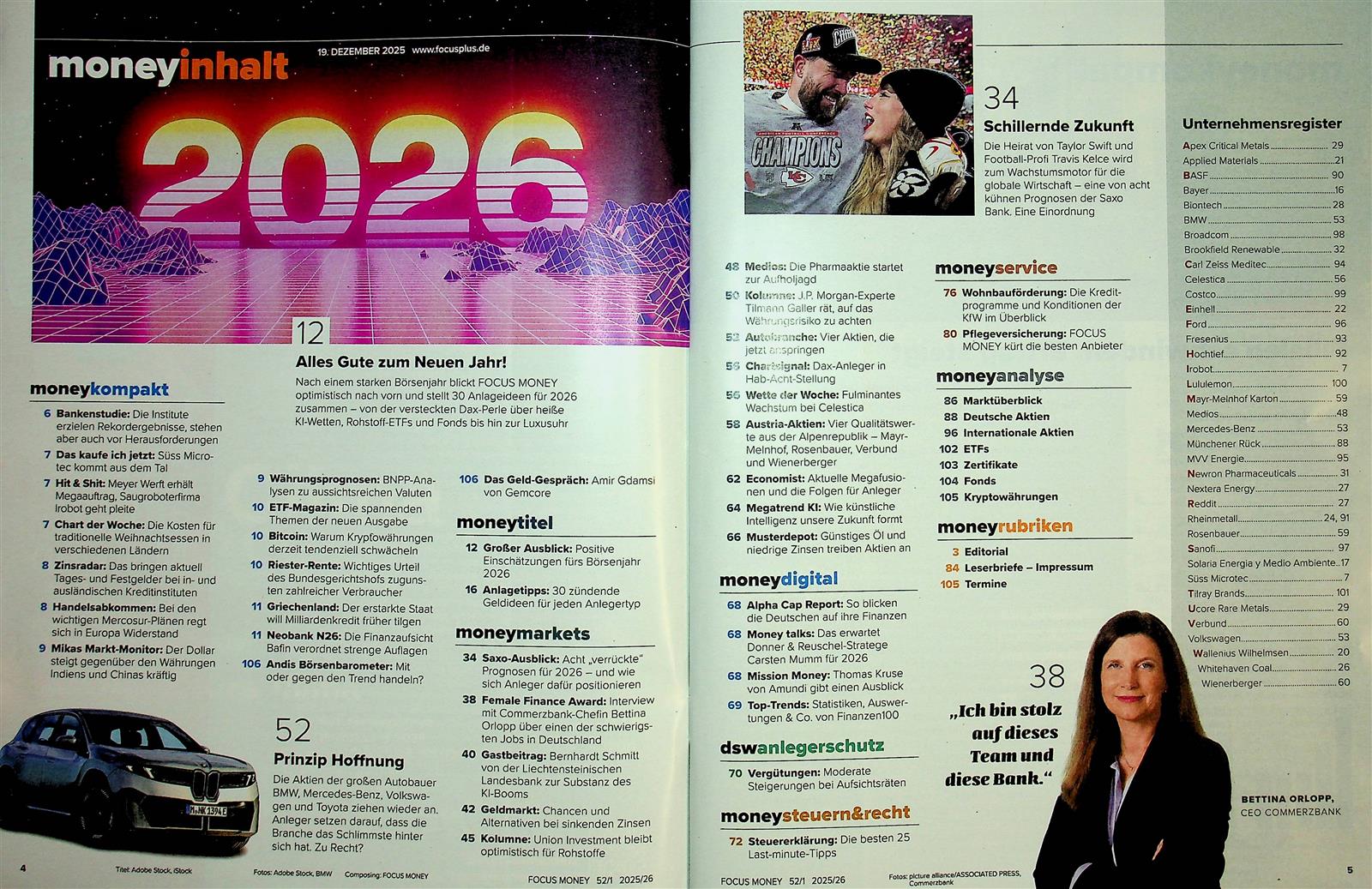 Das Magazin deckt ein breites Spektrum an Themen ab, von detaillierten Analysen zu Aktien, Fonds und Anleihen bis hin zu politischen Entwicklungen, die die Finanzmärkte beeinflussen. Leser finden fundierte Berichte und Kommentare zu Rohstoffen, Immobilien und Steuerstrategien. Regelmäßige Interviews mit Top-Entscheidern aus Industrie und Finanzwelt bieten tiefere Einblicke und machen das Focus Money Magazin zu einem umfassenden Begleiter für Anlageentscheidungen und wirtschaftliche Orientierung.