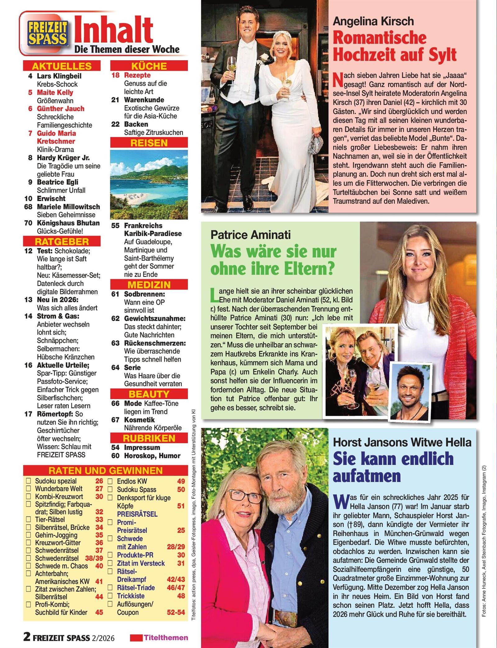 Interviews und Berichte zu Lars Klingbeil, Maite Kelly, Günther Jauch, Guido Maria Kretschmer, Hardy Krüger Jr., Beatrice Egli und Mariele Millowitsch mit persönlichen Einblicken und Lebensgeschichten.