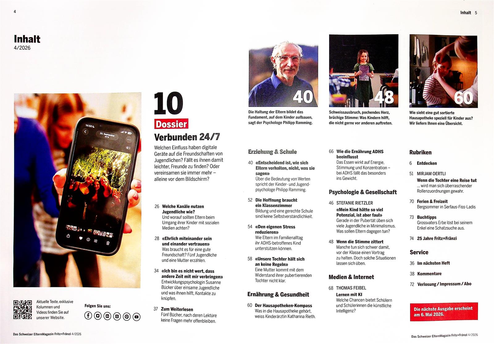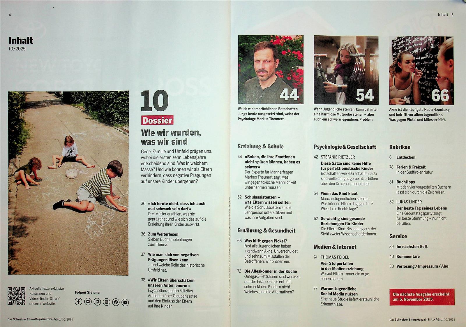 Erziehung, Schule und Berufsplanung, Gesundheit, Freizeit und interkulturelles Zusammenleben: Die Schwerpunkte bilden ein breites Spektrum, das vertieft auf Fragen der Pubertät, des Erwachsenwerdens und möglicherweise damit verbundenen Probleme, Konflikte und Risiken eingeht. Gespickt mit Lern- und Medientipps lässt das Magazin Fachleute zu brisanten und aktuellen Themen zu Wort kommen, tabuisierte Themen werden entzerrt und fundiert aufgearbeitet.