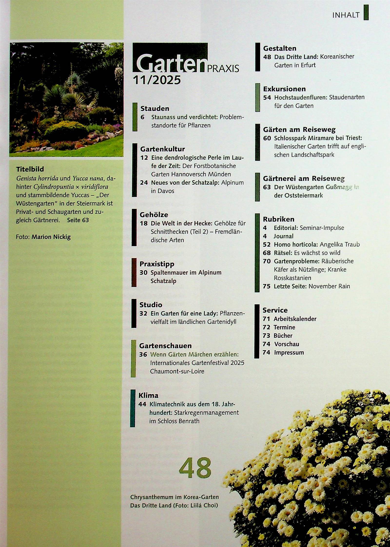 Gartenpraxis ist eine der renommiertesten Fachzeitschriften im deutschsprachigen Raum für professionelle und erfahrene Gärtner:innen. Seit Jahren überzeugt das Magazin durch fundierte Beiträge, wissenschaftlich geprüfte Inhalte und höchste gartenbauliche Fachkompetenz. Anders als klassische Gartenzeitschriften richtet sich Gartenpraxis gezielt an Personen aus der Branche sowie an ambitionierte und fachlich versierte Freizeitgärtner:innen, die sich intensiv mit der Pflanzenverwendung, Gestaltung und Pflege beschäftigen.