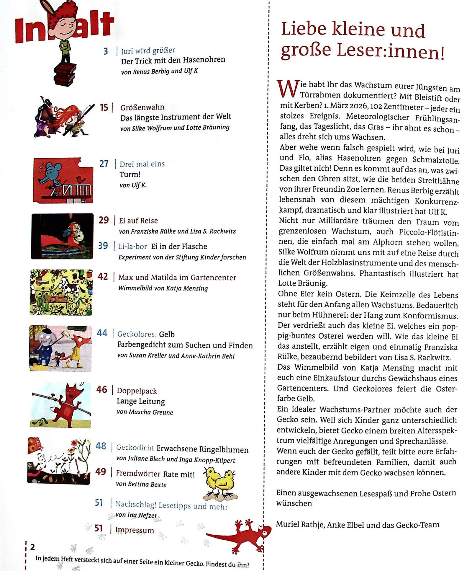 Ich kenne die Zeitschrift "Gecko" seit einigen Jahren und verschenke nun zum zweitenmal ein Abo an einen Enkel. Die vielen thematisch durchs Jahr gehenden (ansprechend illustrierten) Geschichten ab 4 bis ca. 7 Jahren, Basteltipps und Experimente kommen gut an. Die Hefte werden immer wieder angeschaut, bezw. die Geschichten werden immer wieder zum Vorlesen gewünscht. Sehr angenehm fällt auf, dass die Hefte ganz ohne Werbung und Inserate daher kommen.