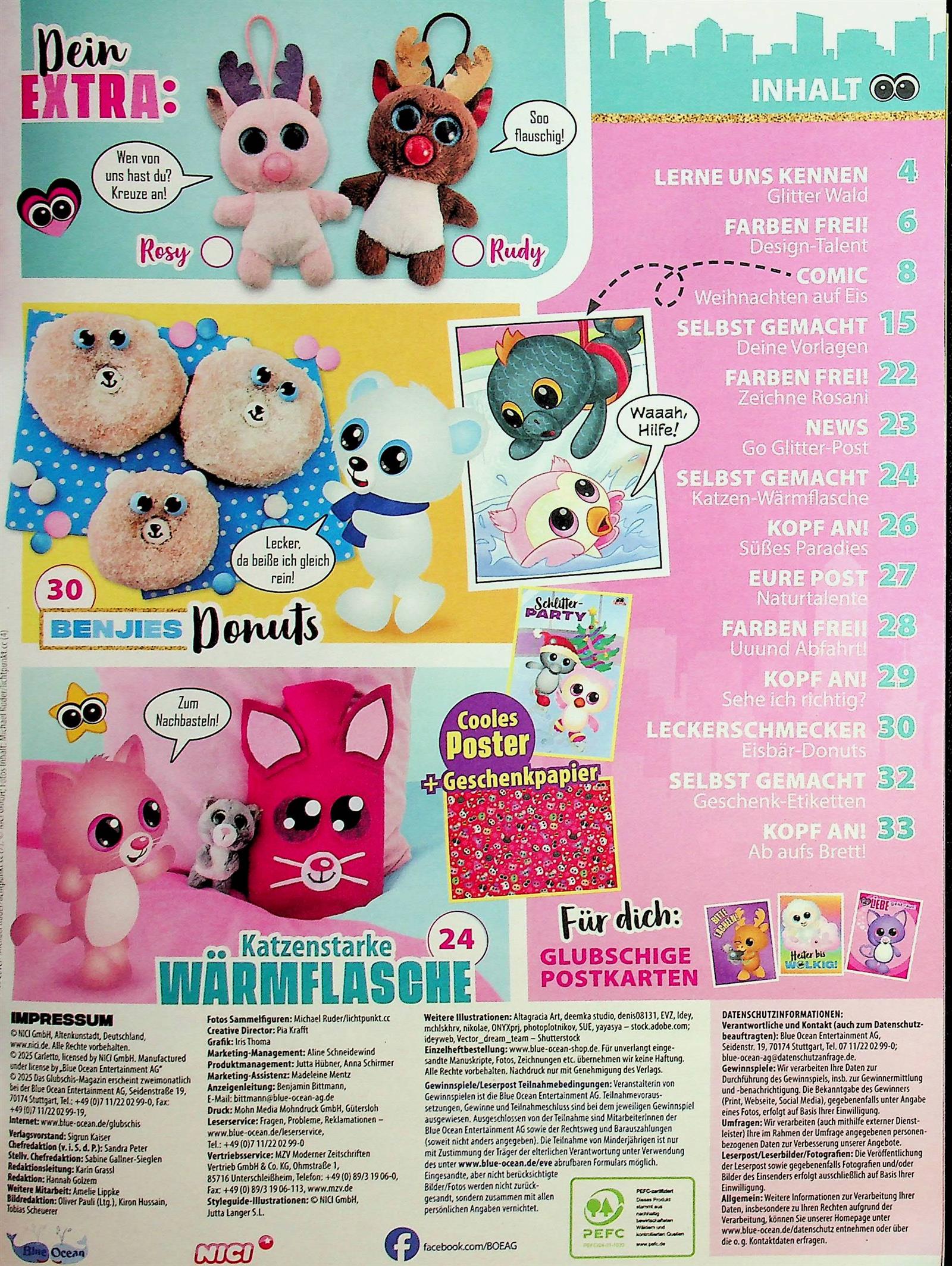 Die kreativ gestaltete Zeitschrift zeigt auf 28 Seiten alles rund um die stets wachsende Bande der liebenswerten NICI-Plüschtiere mit den großen Kulleraugen. Das Highlight im Heft ist der exklusiv gezeichnete Comic, mit dem Kinder in die schillernde Stadt der GLUBSCHIS, die Glitter Town, abtauchen. Dort leben alle GLUBSCHIS zusammen, haben Spaß und erleben spannende Abenteuer mit ihren Freunden. Das GLUBSCHIS Magazin regt mit coolen Bastel- und Backtipps sowie fesselnden Rätseln zum Mitmachen an. Jede Ausgabe enthält außerdem ein Poster, einen XXL-Stickerbogen mit glitzernden GLUBSCHIS-Motiven zum Selbereinkleben sowie Fanpostkarten zum Sammeln und Tauschen.