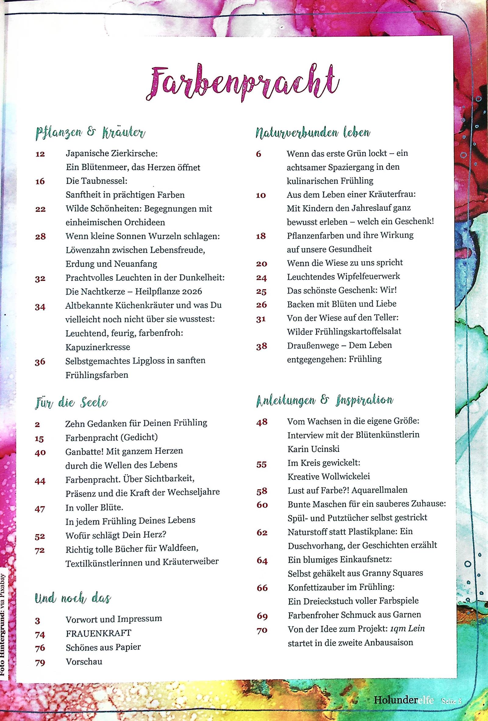 Auf knapp 60 Seiten erwartet die Leser eine ganze Sammlung kreativer Ideen, die auf ihre Umsetzung warten. Aufgeteilt in die Kategorien „Natürlich leben“, „Pflanzen & Kräuter“, „Anleitungen“, „Brauchtum & Handwerk“ und „Für die Seele“ lässt das Magazin das bewährte Wissen um natürliche Rohstoffe und ihre Verarbeitung vergangener Generationen neu entdecken. Wolle färben, filzen, stricken, weben und Schönes für sich, Familie und Freunde herstellen, ist nur ein kleiner Ausschnitt des kreativen Inhalts des Magazins. Denn sie erfahren auch, wie Sie Salben, Tinkturen, Kosmetik- oder Hygieneprodukte leicht zu ihren wertvollen Begleitern des Alltags herstellen können.
