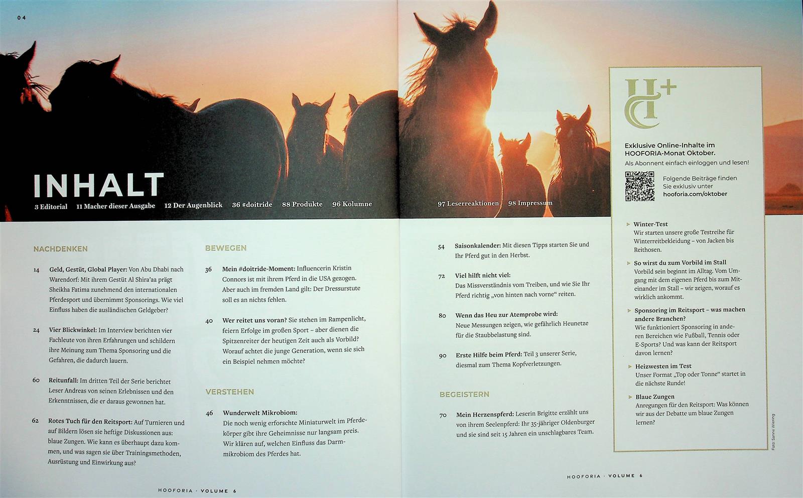 Das neue Pferdemagazin Hooforia startet mit Rubriken wie "Nachdenken" - über etwa Harmonie im Reitsport und die Idee eines Pferde-Führerscheins - und "Verstehen" - über Tierwohl im Allgemeinen und bei Pferden im Besonderen.