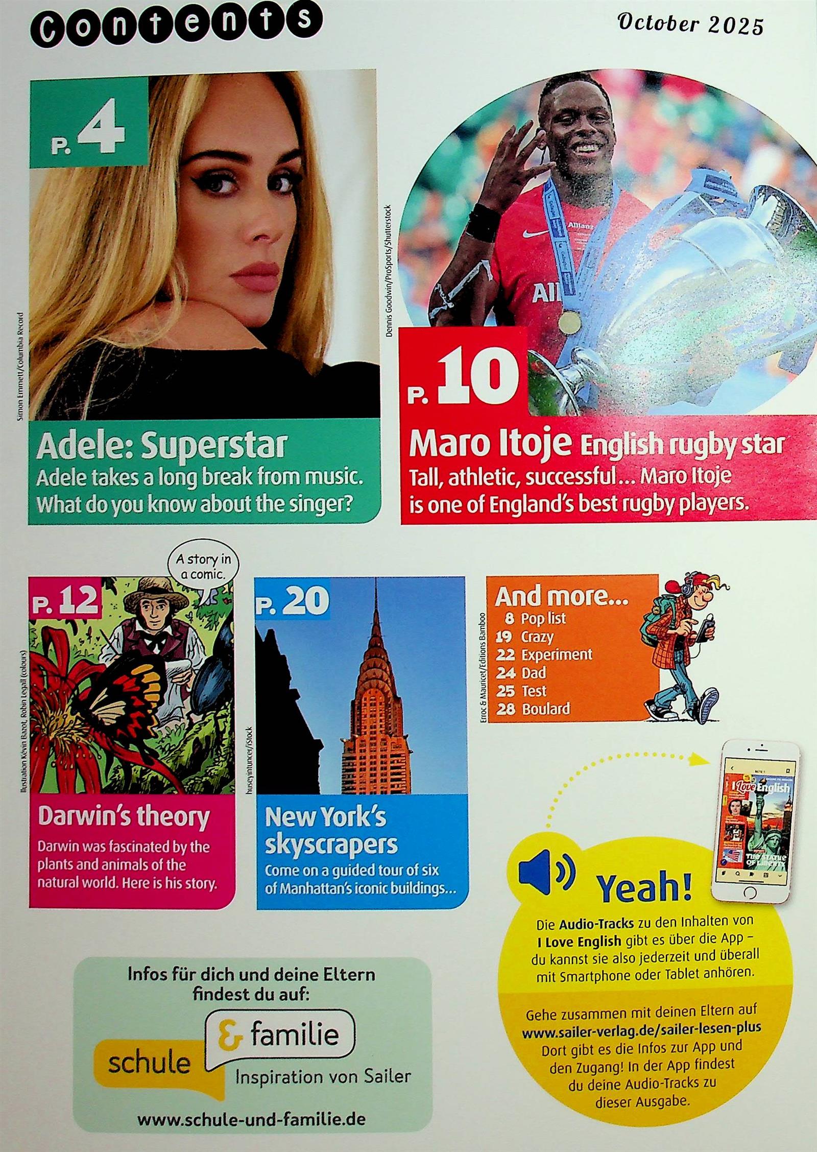 Adele macht gerade eine längere Pause von der Musik. Die Songs der Pop-Diva werden aber weiterhin gehört, gespielt und gesungen. Um die bemerkenswerte Karriere von Adele dreht sich das I Love English Pop-Quiz. Außerdem stellen wir Maro Itoje vor, den Rugby-Star und Kapitän der englischen Rugby-Nationalmannschaft, erzählen im Comic das Leben von Forscher Charles Darwin und schauen uns die Wolkenkratzer New Yorks an. Enjoy!
