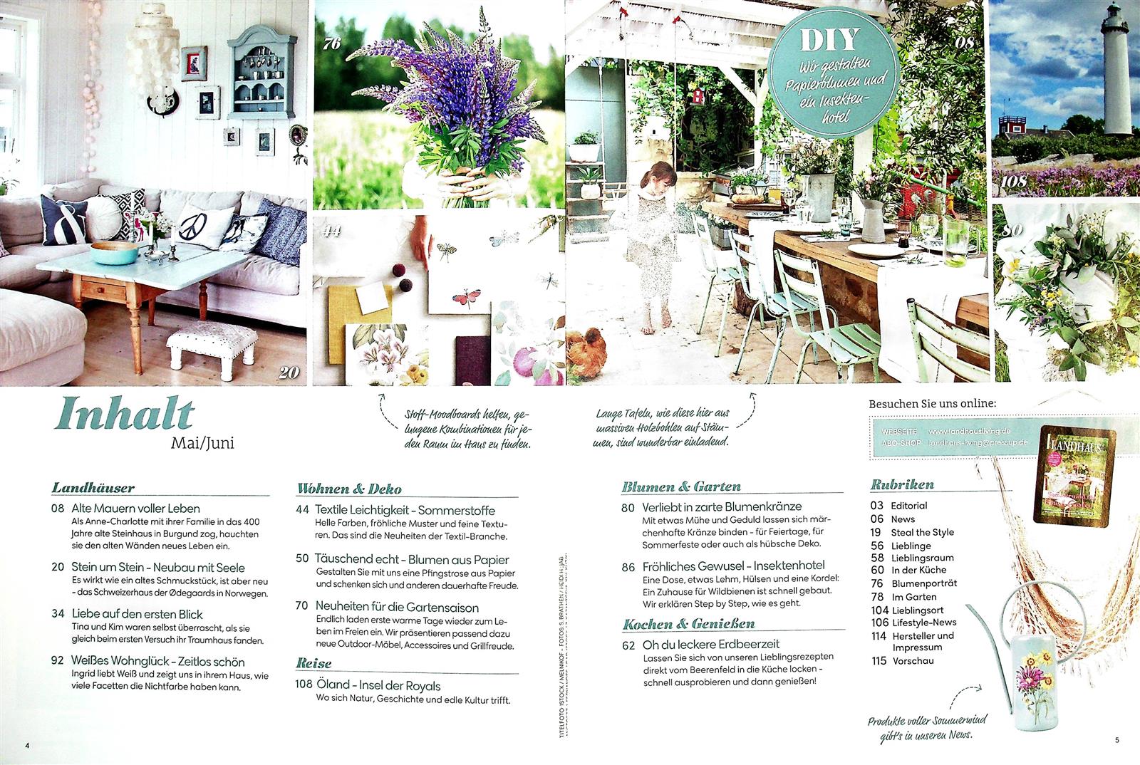 Nostalgisches Wohnen im Landhausstil, DIY-Projekte mit Naturmaterialien, die Farbe des Jahres als Deko-Element, Flower-Power mit Geranien und Rezepte für einen festlichen Oster-Brunch.