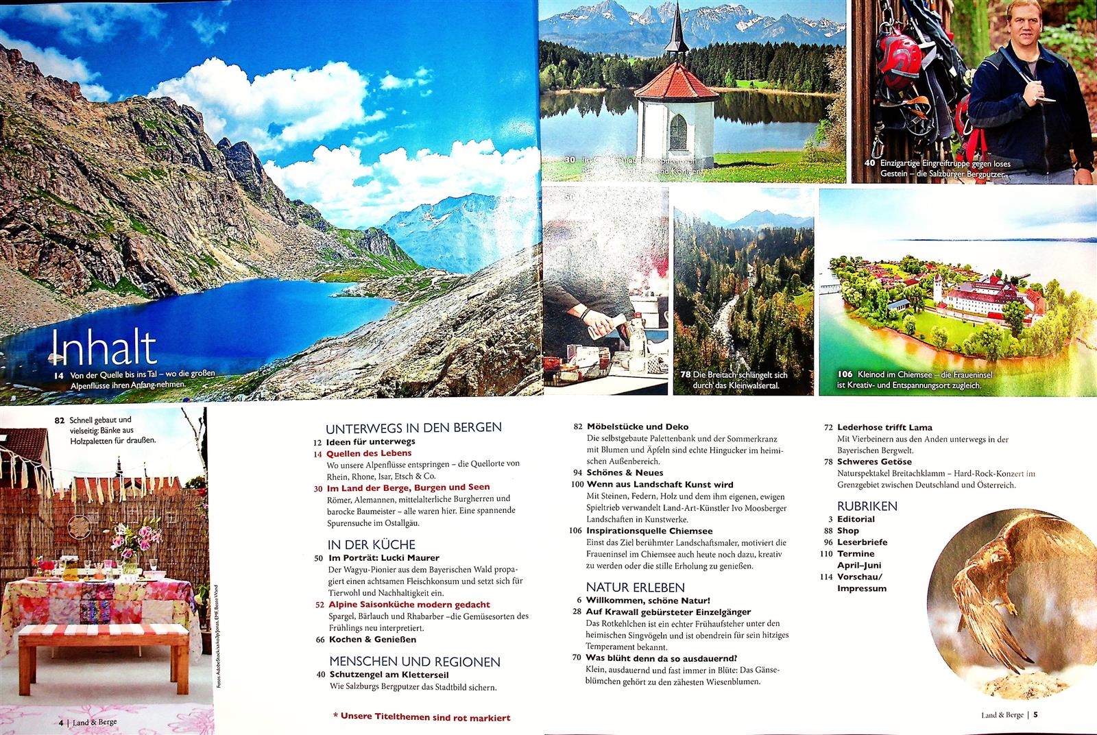 Kennzeichnend für die Land & Berge ist die Kombination aus ländlichen Themen mit der Welt des Wanderns und Bergsteigens.