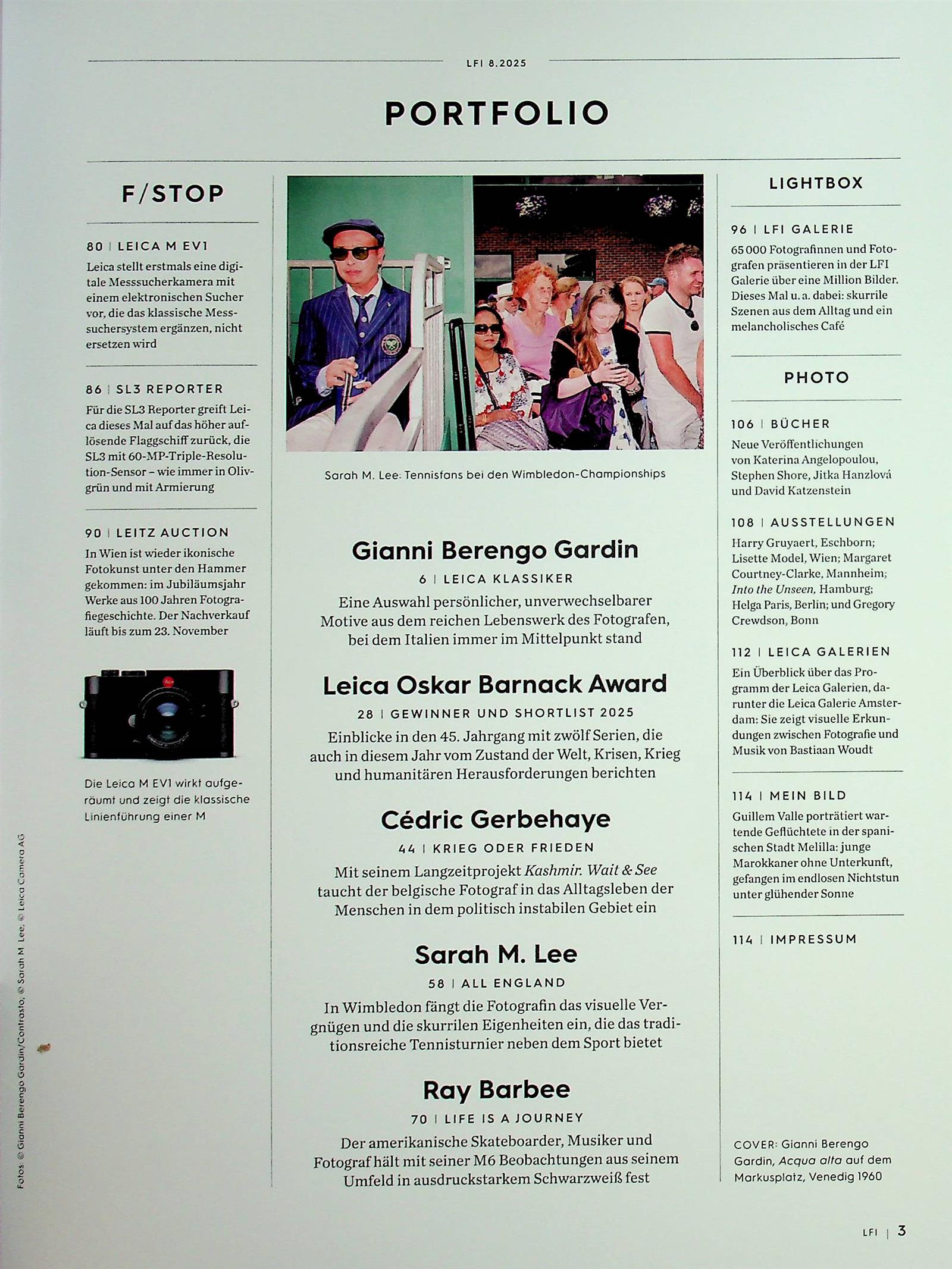 Das renommierte und qualitativ sensationell gefertigte Magazin präsentiert LFI Portfolios und Reportagen herausragender Leica – Fotografen, von klassischer Fotografie, bis zu Meistern der zeitgenössischen Fotografie hin zu jungen Talenten und den besten Fotografen aus der LFI-Lesergalerie.