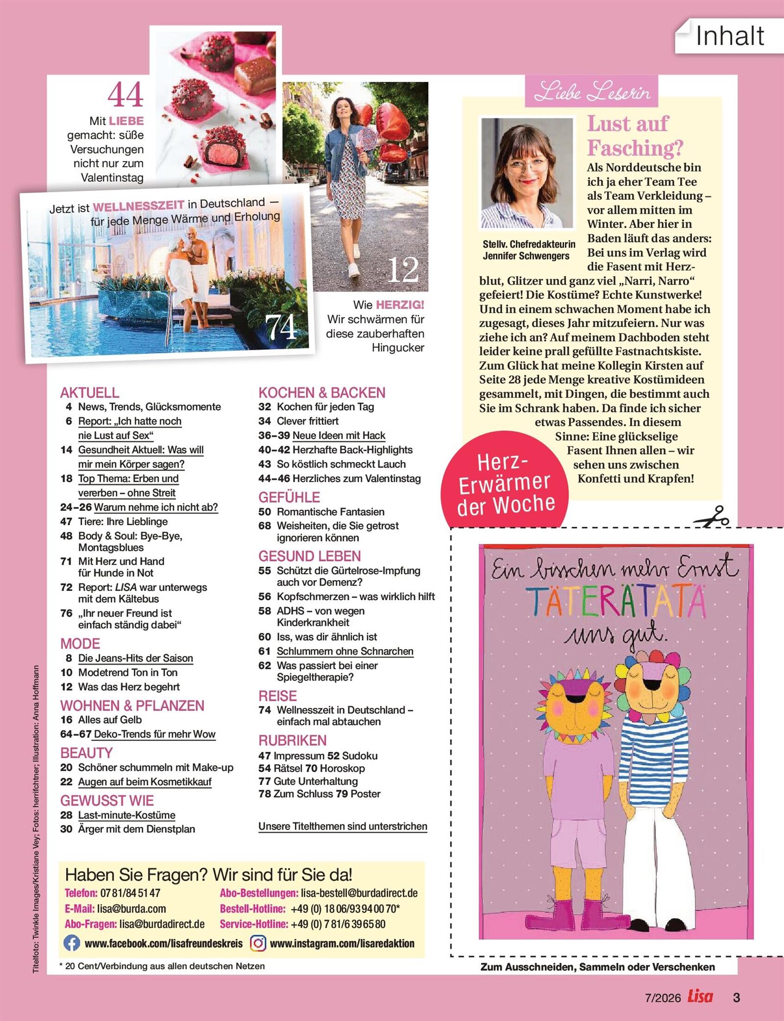 Ich bin enttäuscht, die Lisa fande ich einmal interessanter. Als "im Leben stehende Frau" muss ich nicht lesen, das ich eine Laufmache mit Nagellack stoppen kann oder muss wissen wie hoch mein Sex IQ ist. Die Rezepte sprechen macht nicht an. Schade.