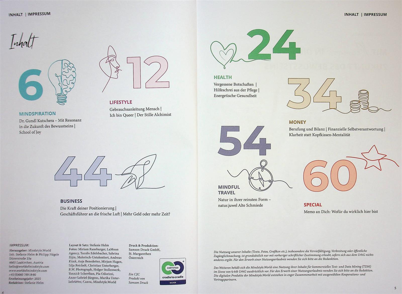 Inhalte: Lifestyle mit Substanz, ganzheitliche Gesundheit, Business-Strategien mit Sinn, Money Mindset für finanzielle Klarheit, Mindful Travel für bewusstes Reise sowie inspirierende Portraits, Interviews und Specials, die echte Veränderung ins Leben bringen. Das Magazin liefert Hintergründe, Methoden, Übungen und Best Practices – hochwertig und nachhaltig produziert, spürbar, inspirierend.
