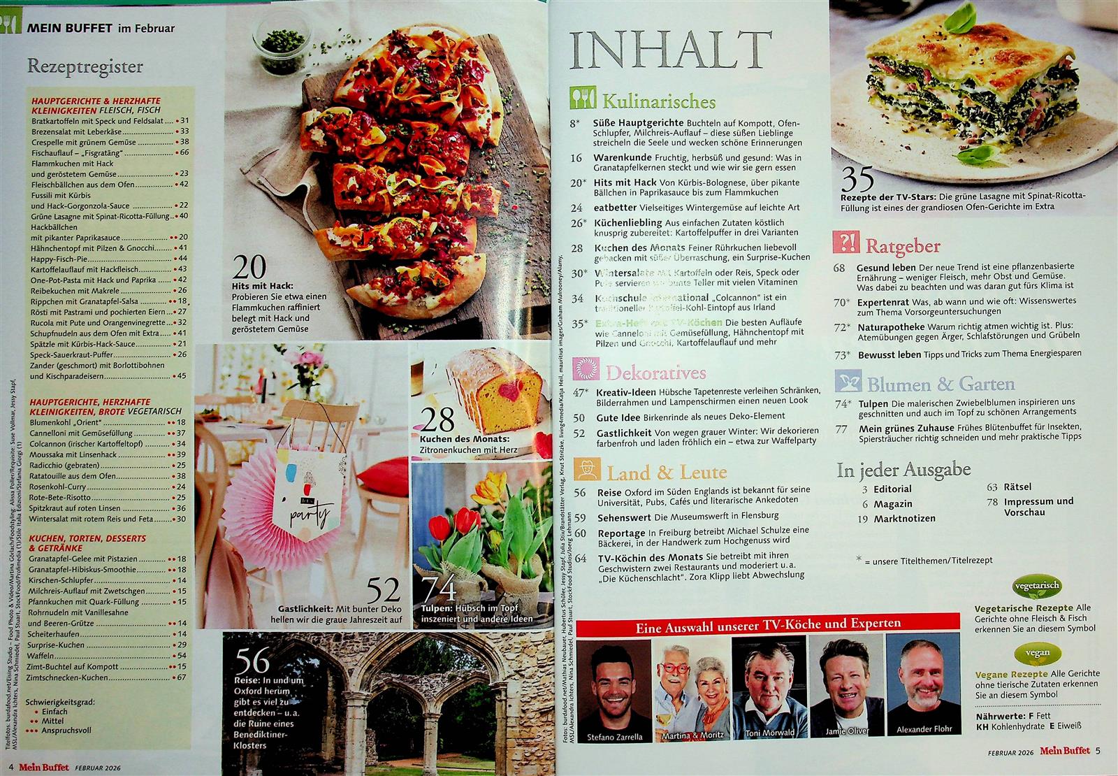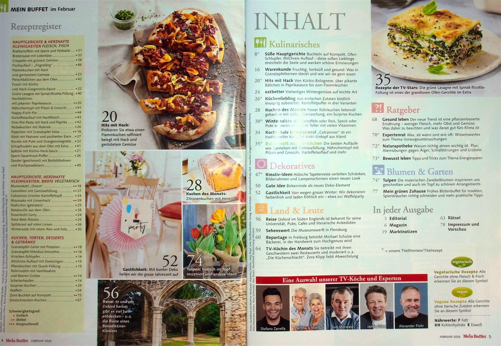 Blättert man die Seiten von Mein Buffet durch, läuft einem regelrecht das Wasser im Mund zusammen, denn das Magazin präsentiert zahlreiche Koch- und Backideen. Es überzeugt dabei mit einer großen Bandbreite – vom Küchenklassiker, über das preiswerte Rezept für jeden Tag, bis hin zum leckeren Kuchen für die Nachmittagstafel. Zudem begleitet das Magazin die beliebtesten TV-Köche. In einem Extra-Beihefter werden ihre kulinarischen Kreationen gesammelt präsentiert.