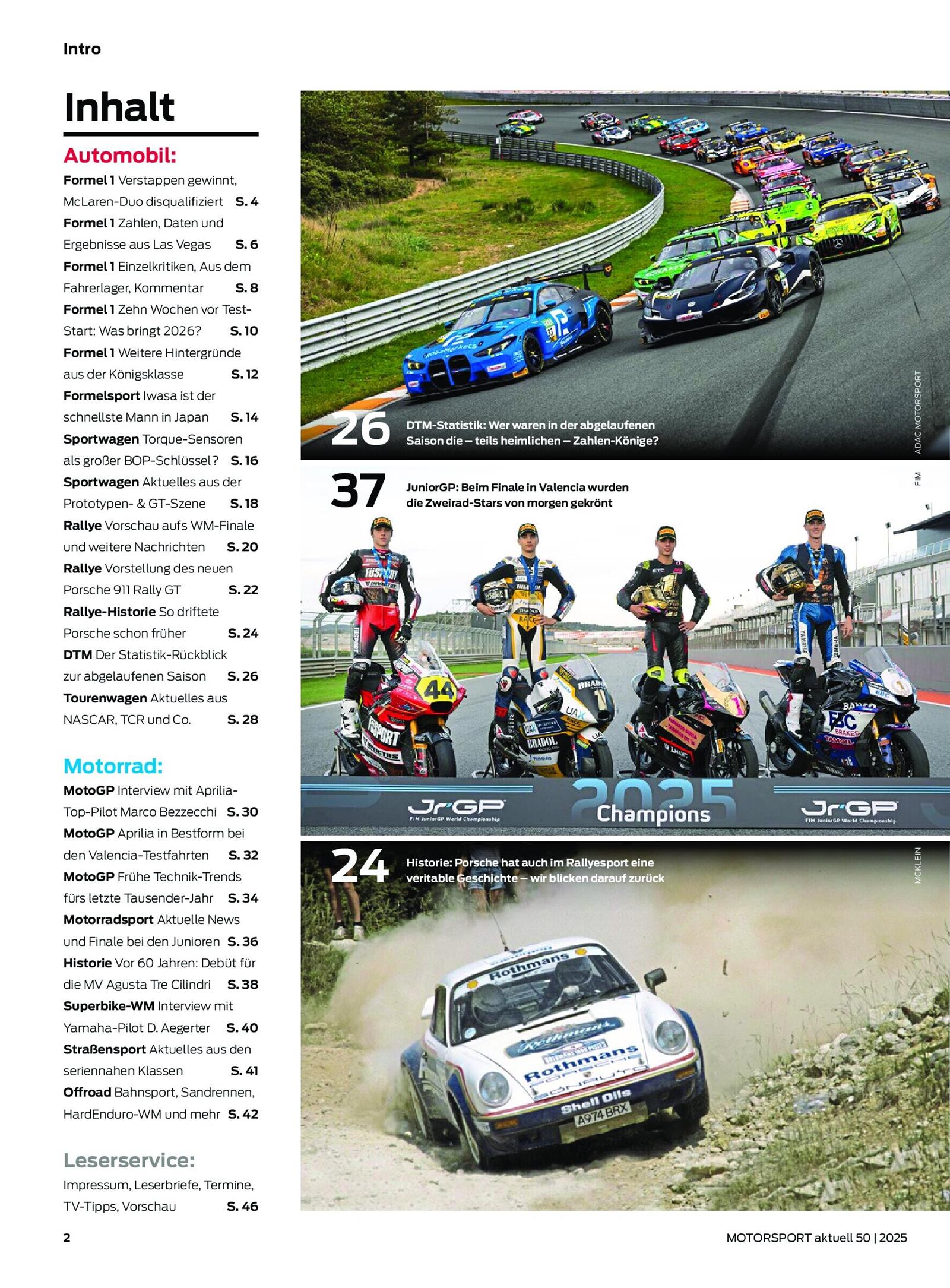 Einmal in der Woche erscheint die Zeitschrift MOTORSPORT aktuell und informiert über alles Wissenswerte aus dem Auto- und Motorradrennsport sowie dem Rallyebereich. Das Magazin stammt ursprünglich aus der Schweiz und wurde erstmals 1963 herausgegeben.