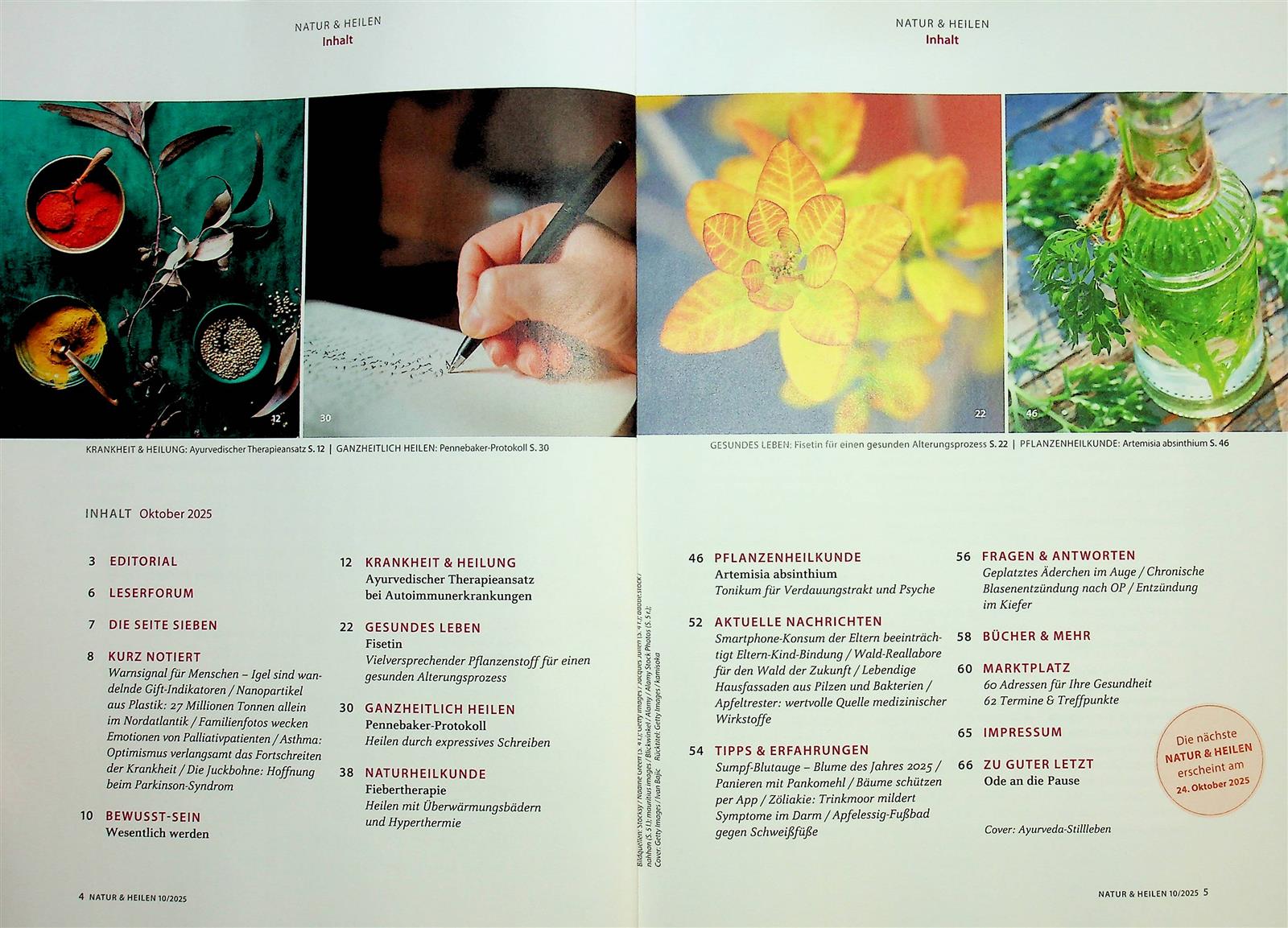Seit etlichen Jahren beziehe ich Natur und Heilen und bin immer wieder überrascht, dass es stets neue wichtige Themen gibt. Die Inhalte sind so vielseitig, interessant, wissenswert und leicht verständlich , so dass es eine Pflichtlektüre sein könnte, wenn man sich eigenverantwortlich um seine Gesundheit kümmern möchte. Ich habe im Laufe der Jahre bereits mehrere Geschenk-Abbos verschenkt und alle wollten diese Zeitschrift nicht mehr missen.