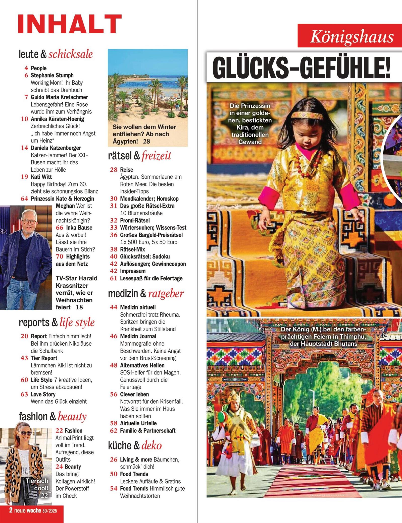 Für den bunten und informativen Mix stehen auch die weiteren Schwerpunkte des Magazins. Ein großer Service- und Ratgeberteil hält eine Vielzahl von Tipps bereit. Top-aktuelle Fashion-Trends, die angesagten Beauty-Styles, Living- und Foodthemen mit der Neuen Woche bleiben Sie auch in diesen Bereichen immer bestens informiert. Mit Tipps zu Geld- und Rechtsfragen, fundierten Informationen zu Gesundheitstrends und Ratschlägen in Sachen Partnerschaft wird die überaus umfassende Themenauswahl abgerundet.