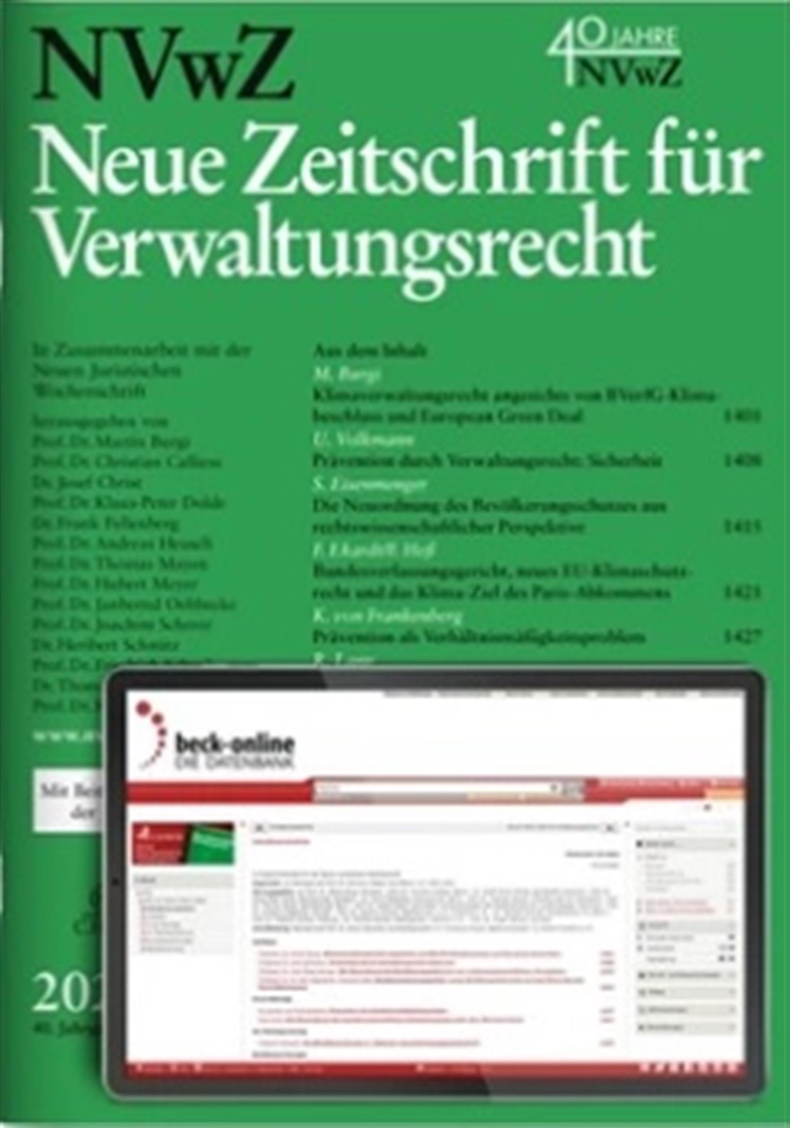 NVwZ ist Deutschlands bedeutendste Fachzeitschrift für Verwaltungsrecht und erscheint in Zusammenarbeit mit der NJW, Deutschlands führender juristischer Fachzeitschrift. Sie informiert umfassend über das gesamte Verwaltungsrecht und das allgemeine öffentliche Recht, zum Beispiel: