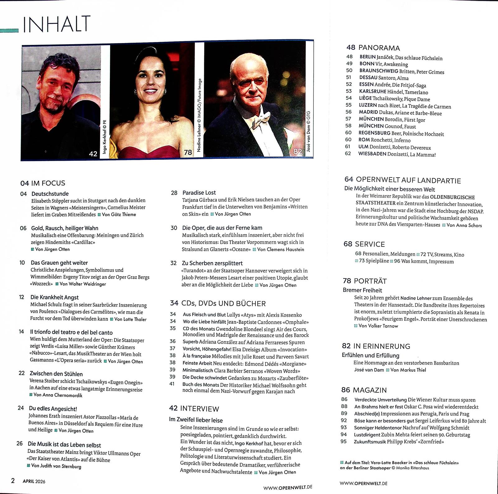 Wer einen Ausflug in die Opernwelt unternehmen möchte, ist mit der gleichnamigen Zeitschrift bestens beraten. Mit JAHRBUCH. Das Magazin genießt innerhalb Europas eine besondere Reputation und setzt seit vielen Jahrzehnten den Standard in der Berichterstattung über das Operngeschehen. Unterstrichen wird dies unter anderem durch die viel beachtete Herausgabe eines Jahrbuchs sowie die Verleihung der Titel „Opernhaus des Jahres“, „Aufführung des Jahres“ etc., zu der 50 Opernkritiker zusammenfinden. Ebenfalls finden sich Reportagen über Opernhäuser und Bühnen, Porträts einzelner Komponisten oder Solisten sowie jede Menge Besprechungen neuer CDs und Bücher rund um das Operngeschehen. Ein großes Augenmerk liegt auch auf dem Veranstaltungskalender, der überaus umfangreich präsentiert wird.