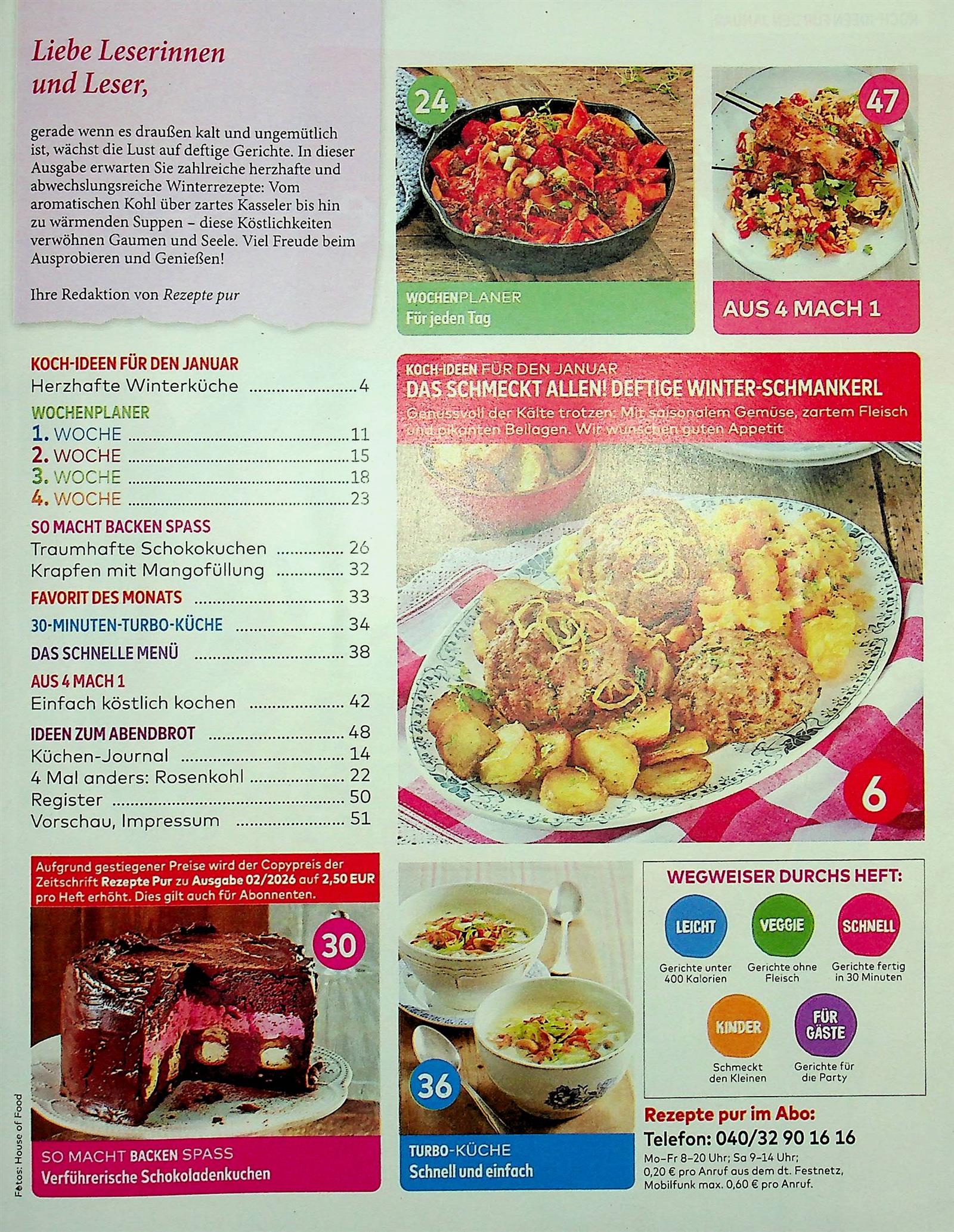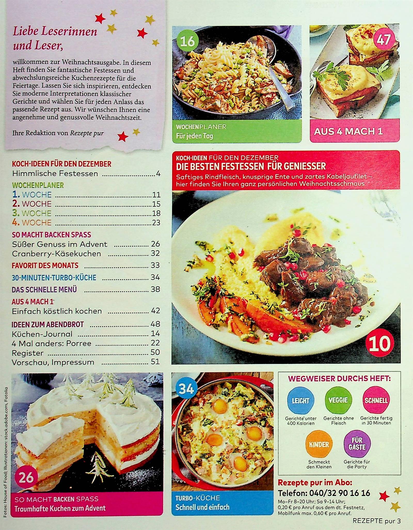 Ganz auf das Wesentliche konzentriert sich die Rezepte pur – praktische Rezeptvorschläge, schnell und einfach jeden Tag umsetzbar, stehen im Mittelpunkt. In der Rubrik „Koch-Idee des Monats“ werden Rezeptideen vorgestellt, die mit dem Gemüse der Saison perfekt in das manchmal knappe Familienbudget passen. Ein praktischer Wochenplaner mit 28 Rezepten unterstützt bei der gesunden und ausgewogenen Ernährung und stellt interessante Rezepte für jeden Tag zusammen. Mit der Turbo-Küche gelingt auch das Kochen in 20 Minuten, und in den schnellen Menüs hält die Zeitschrift zudem Gerichte parat, die sich perfekt in den hektischen Alltag zwischen Kindern oder Beruf einfügen lassen. Dazu gehört auch die Kategorie „Vier mal anders“, in der Lebensmittel auf vier verschiedene Arten zubereitet werden. Optimal, damit alles aufgebraucht werden kann und trotzdem keine Langeweile beim Essen aufkommt.