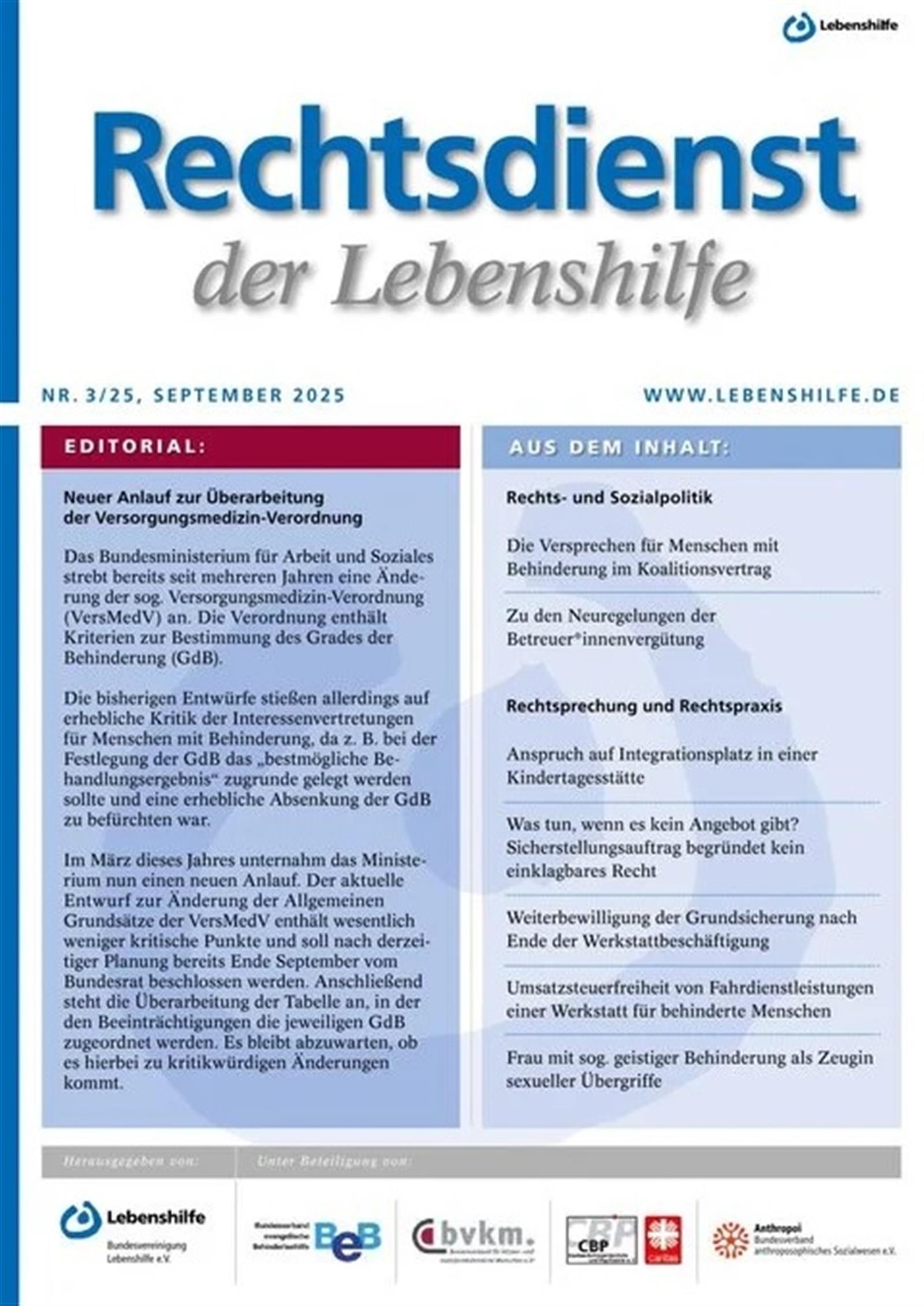 Die von der Bundesvereinigung Lebenshilfe publizierte Zeitschrift Rechtsdienst der Lebenshilfe informiert regelmäßig über Behindertenpolitische Entwicklungen, Reformen in der Sozialgesetzgebung, sowie aktuelle Rechtsprechung, die behinderte Menschen und ihre Angehörigen betrifft.
