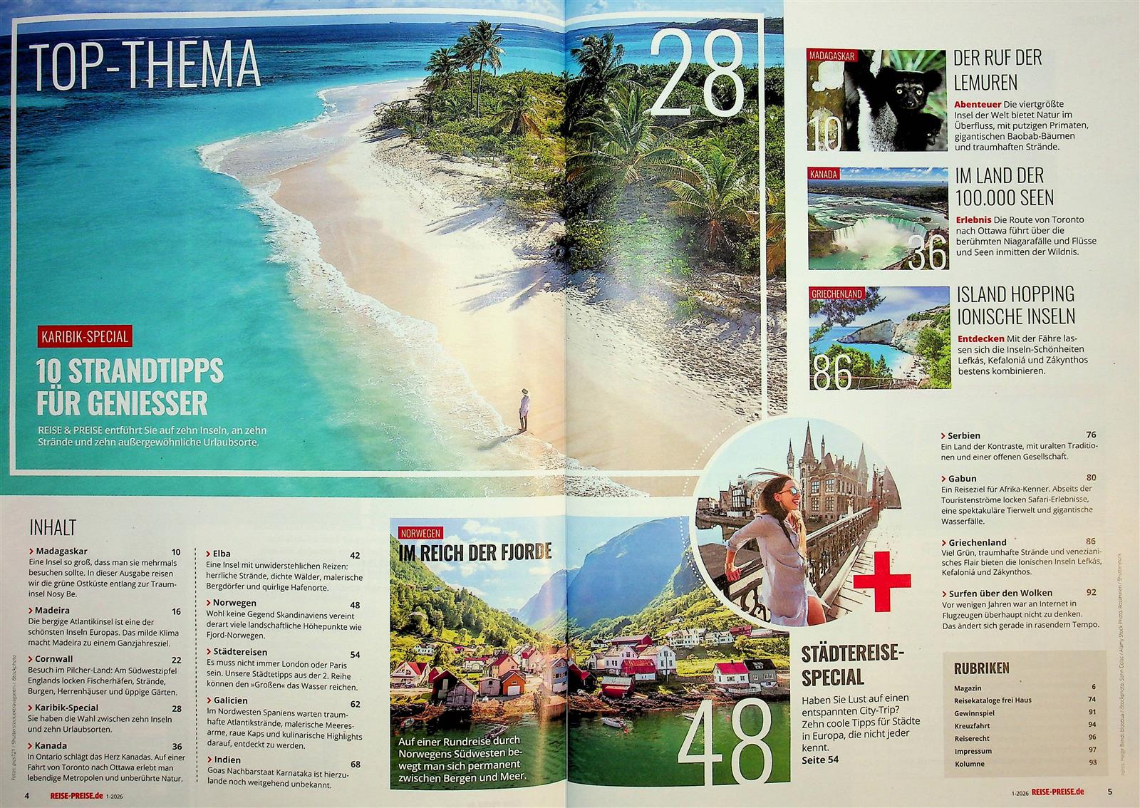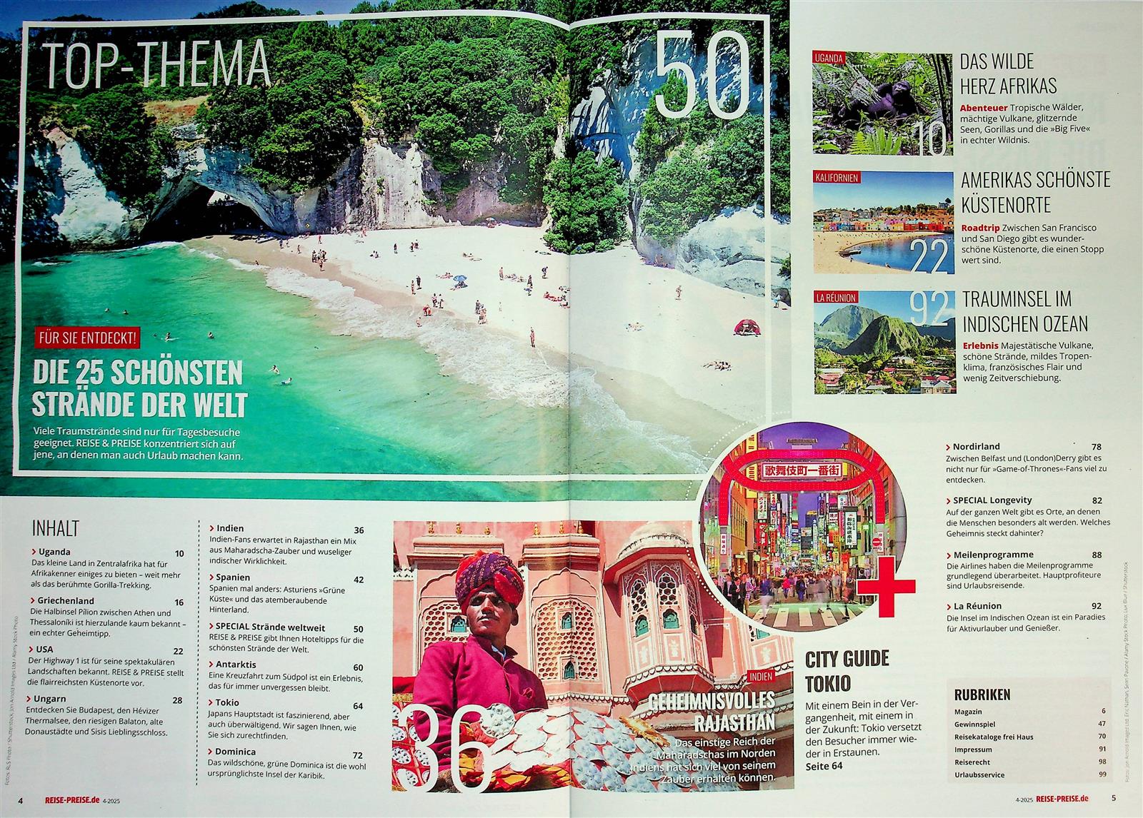 REISE & PREISE überzeugt vor allem durch die vielen Tests, die eine gute Orientierung für die Reisebuchung geben, sowie durch umfangreiche Preisangaben z.B. aller Nebenkosten im Urlaubsland. So weiß jeder bereits im Vorwege, was einen erwartet
