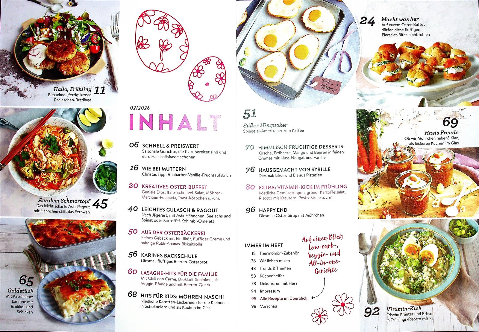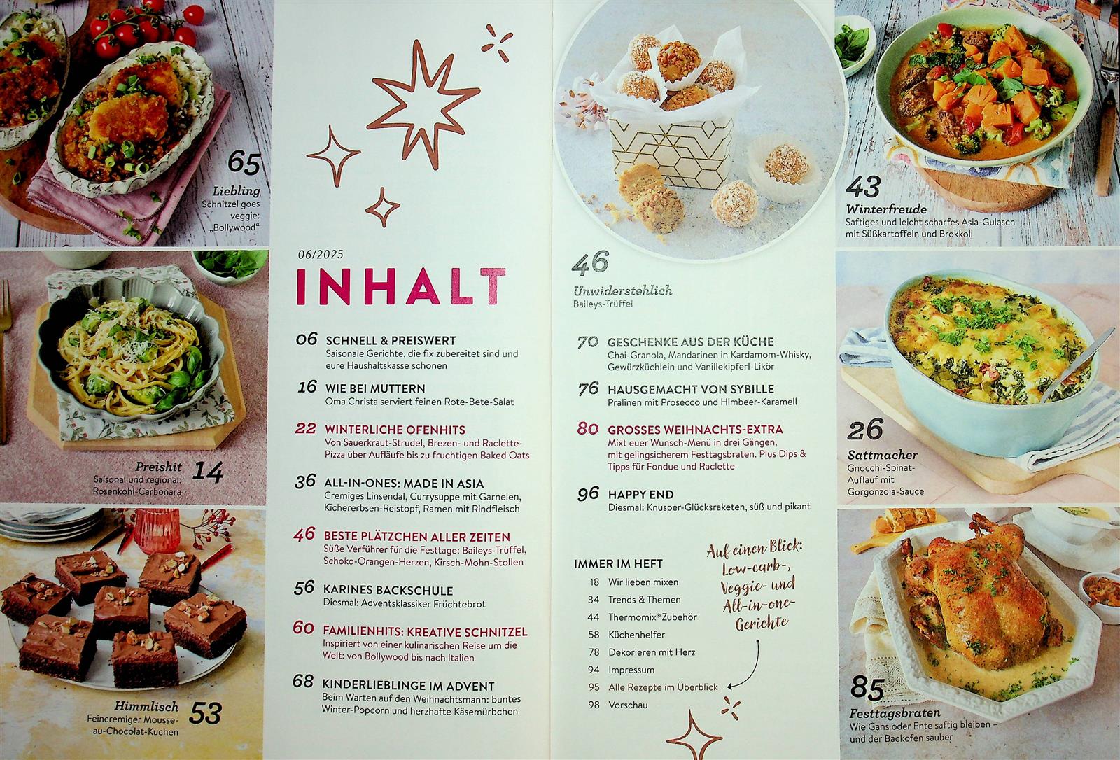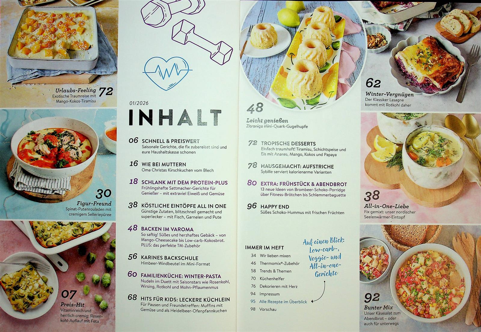 Jede Ausgabe der Rezepte mit Herz präsentiert den Lesern über 60 selbst entwickelte Rezepte aller Art und für jeden Anlass. Diese sind allesamt getestet und durch die Zuverlässigkeit des Thermomix auch gelingsicher. Von Rezepten für den Alltag über eine große Auswahl an Familienmenüs bis hin zu großen Partys ist für jeden Anlass etwas Passendes dabei. Des Weiteren findet der Thermomix-Fan in jedem Heft wertvolle Mix- und Backtipps. Abgerundet wird das Ganze durch Porträts bekannter Influenzer und Youtuber, die sich auf ihren Kanälen mit dem Thema Thermomix beschäftigen. Zu bestimmten Jahreszeiten gefällt die Rezepte mit Herz mit besonderen Aktionen, wie z.B. dem Adventskalender, bei dem jedes Türchen ein Rezept beinhaltet, welches von einem Youtube-Kanal präsentiert und live im Thermomix zubereitet wird.