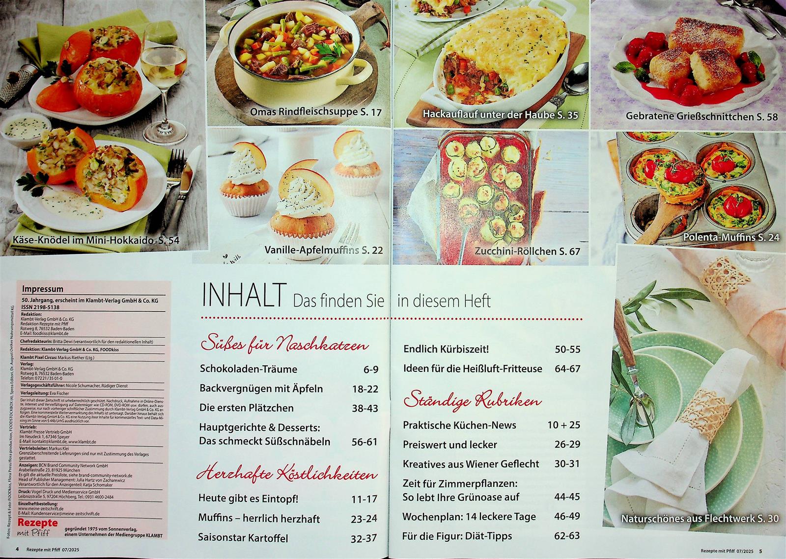 Rezepte mit Pfiff fällt in die Kategorie der praktischen Rezeptzeitschriften. Wem der Sinn nach Alternativen steht, der greift auch zu kochen & genießen, oder Mein Buffet.