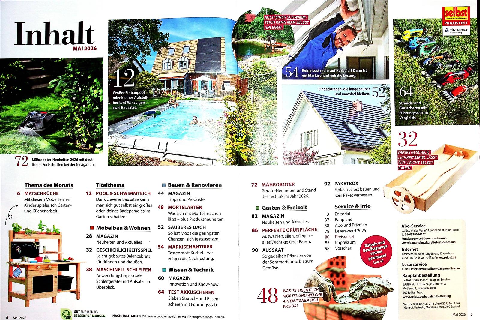 Smarthome-Produkte, Werkzeugneuheiten und -qualitäten – TÜV geprüft oder selbst von der Redaktion getestet, das Magazin sorgt für den neusten Stand über Bohrmaschine und Co. und erläutert auch gleich in Anleitungen alles zur praxisnahen Handhabung. Heimwerken, das ist auch Gartenarbeit. Vom Terrassenbau bis zum Hochbeet, vom Gartenhaus bis zu Vogelhäusern ein neues Projekt – perfekt erklärt – für den eigenen Garten lässt sich mit Selbst ist der Mann schnell finden. Tipps und Tricks rund um Gärtnern runden den Themenbereich ab.